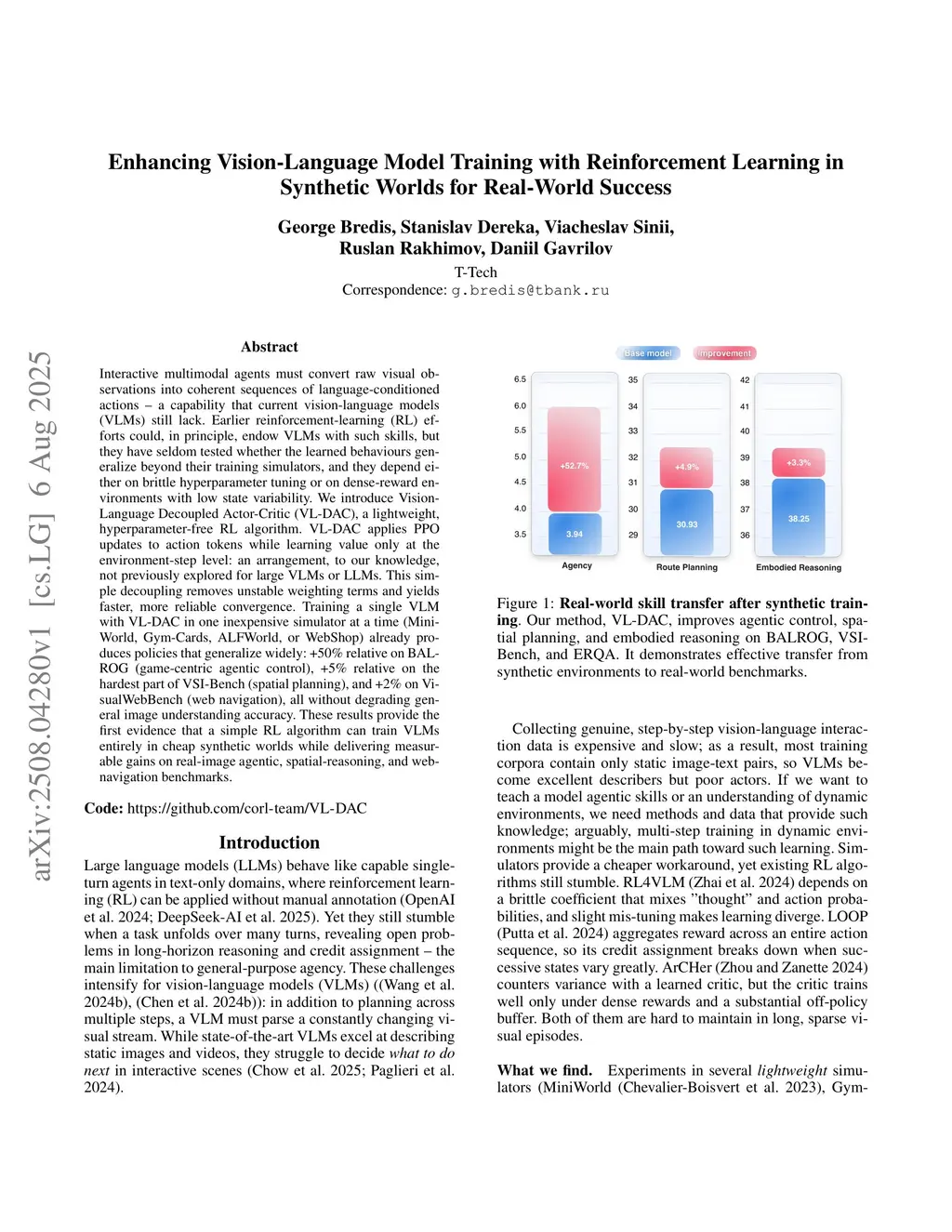 Interactive multimodal agents must convert raw visual observations into coherent sequences of language-conditioned actions -- a capability that current vision-language models (VLMs) still lack. Earlier reinforcement-learning (RL) efforts could, in principle, endow VLMs with such skills, but they have seldom tested whether the learned behaviours generalize beyond their training simulators, and they depend either on brittle hyperparameter tuning or on dense-reward environments with low state variability. We introduce Vision-Language Decoupled Actor-Critic (VL-DAC), a lightweight, hyperparameter-free RL algorithm. VL-DAC applies PPO updates to action tokens while learning value only at the environment-step level: an arrangement, to our knowledge, not previously explored for large VLMs or LLMs. This simple decoupling removes unstable weighting terms and yields faster, more reliable convergence. Training a single VLM with VL-DAC in one inexpensive simulator at a time (MiniWorld, Gym-Cards, ALFWorld, or WebShop) already produces policies that generalize widely: +50\% relative on BALROG (game-centric agentic control), +5\% relative on the hardest part of VSI-Bench (spatial planning), and +2\% on VisualWebBench (web navigation), all without degrading general image understanding accuracy. These results provide the first evidence that a simple RL algorithm can train VLMs entirely in cheap synthetic worlds while delivering measurable gains on real-image agentic, spatial-reasoning, and web-navigation benchmarks.