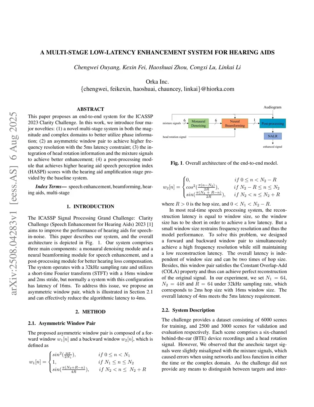 This paper proposes an end-to-end system for the ICASSP 2023 Clarity Challenge. In this work, we introduce four major novelties: (1) a novel multi-stage system in both the magnitude and complex domains to better utilize phase information; (2) an asymmetric window pair to achieve higher frequency resolution with the 5ms latency constraint; (3) the integration of head rotation information and the mixture signals to achieve better enhancement; (4) a post-processing module that achieves higher hearing aid speech perception index (HASPI) scores with the hearing aid amplification stage provided by the baseline system.