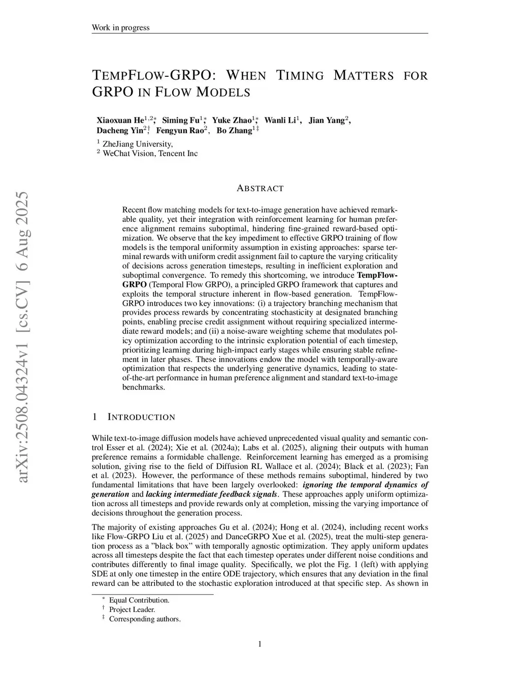 Recent flow matching models for text-to-image generation have achieved remarkable quality, yet their integration with reinforcement learning for human preference alignment remains suboptimal, hindering fine-grained reward-based optimization. We observe that the key impediment to effective GRPO training of flow models is the temporal uniformity assumption in existing approaches: sparse terminal rewards with uniform credit assignment fail to capture the varying criticality of decisions across generation timesteps, resulting in inefficient exploration and suboptimal convergence. To remedy this shortcoming, we introduce \textbf{TempFlow-GRPO} (Temporal Flow GRPO), a principled GRPO framework that captures and exploits the temporal structure inherent in flow-based generation. TempFlow-GRPO introduces three key innovations: (i) a trajectory branching mechanism that provides process rewards by concentrating stochasticity at designated branching points, enabling precise credit assignment without requiring specialized intermediate reward models; (ii) a noise-aware weighting scheme that modulates policy optimization according to the intrinsic exploration potential of each timestep, prioritizing learning during high-impact early stages while ensuring stable refinement in later phases; and (iii) a seed group strategy that controls for initialization effects to isolate exploration contributions. These innovations endow the model with temporally-aware optimization that respects the underlying generative dynamics, leading to state-of-the-art performance in human preference alignment and text-to-image benchmarks.