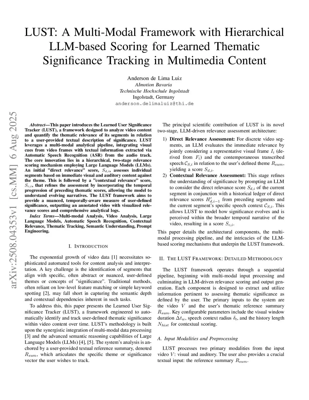 LUST: A Multi-Modal Framework with Hierarchical LLM-based Scoring for Learned Thematic Significance Tracking in Multimedia Content