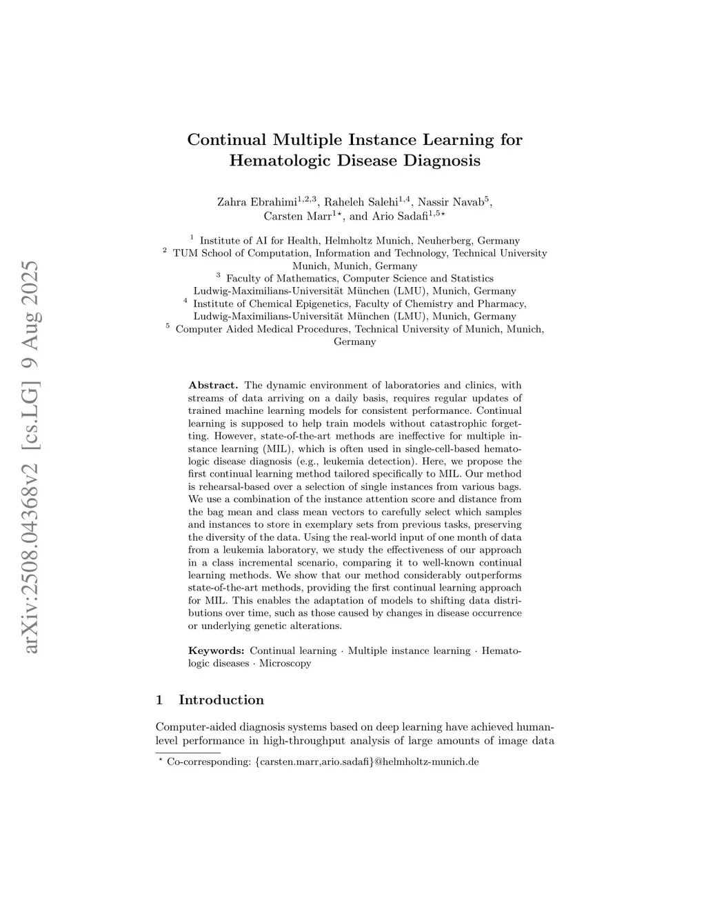 The dynamic environment of laboratories and clinics, with streams of data arriving on a daily basis, requires regular updates of trained machine learning models for consistent performance. Continual learning is supposed to help train models without catastrophic forgetting. However, state-of-the-art methods are ineffective for multiple instance learning (MIL), which is often used in single-cell-based hematologic disease diagnosis (e.g., leukemia detection). Here, we propose the first continual learning method tailored specifically to MIL. Our method is rehearsal-based over a selection of single instances from various bags. We use a combination of the instance attention score and distance from the bag mean and class mean vectors to carefully select which samples and instances to store in exemplary sets from previous tasks, preserving the diversity of the data. Using the real-world input of one month of data from a leukemia laboratory, we study the effectiveness of our approach in a class incremental scenario, comparing it to well-known continual learning methods. We show that our method considerably outperforms state-of-the-art methods, providing the first continual learning approach for MIL. This enables the adaptation of models to shifting data distributions over time, such as those caused by changes in disease occurrence or underlying genetic alterations.