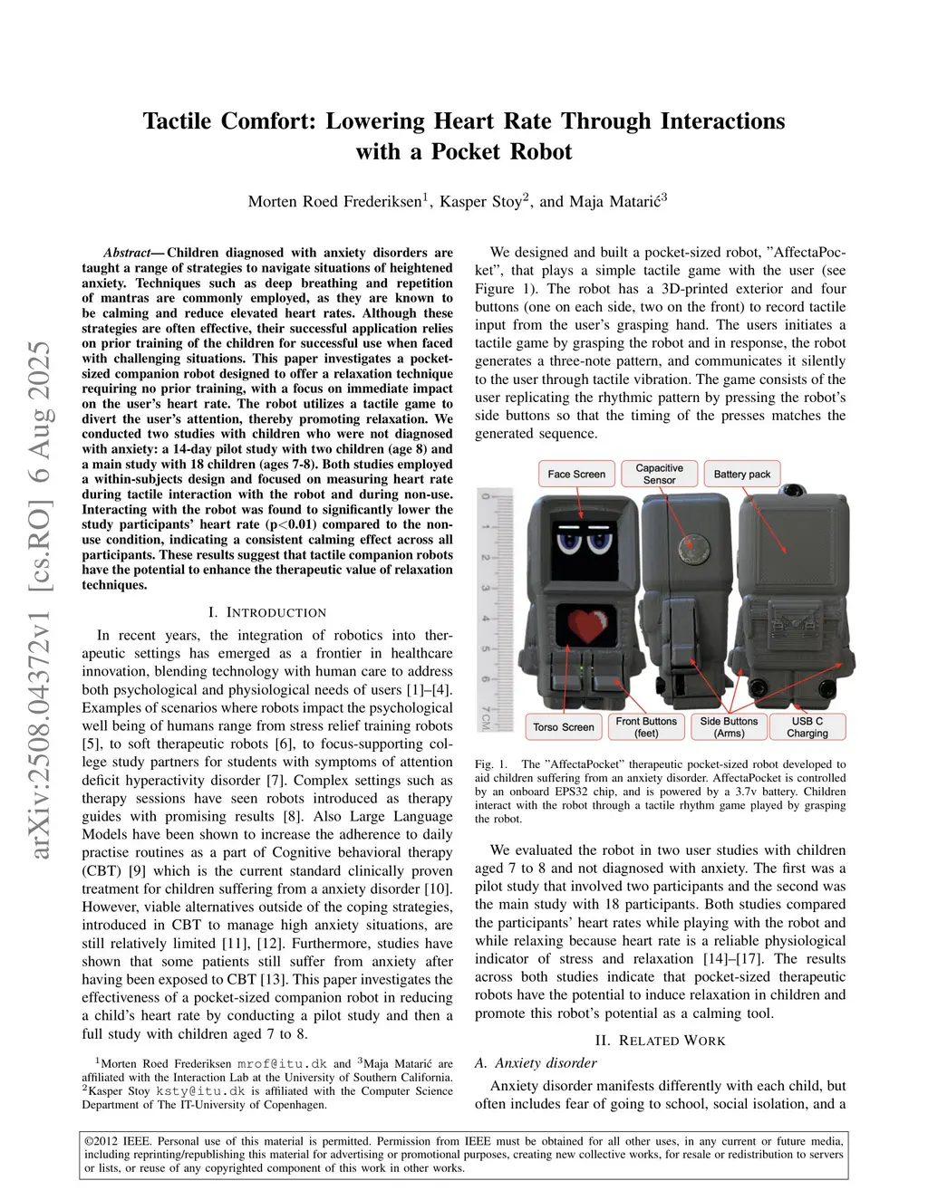 Children diagnosed with anxiety disorders are taught a range of strategies to navigate situations of heightened anxiety. Techniques such as deep breathing and repetition of mantras are commonly employed, as they are known to be calming and reduce elevated heart rates. Although these strategies are often effective, their successful application relies on prior training of the children for successful use when faced with challenging situations. This paper investigates a pocket-sized companion robot designed to offer a relaxation technique requiring no prior training, with a focus on immediate impact on the user's heart rate. The robot utilizes a tactile game to divert the user's attention, thereby promoting relaxation. We conducted two studies with children who were not diagnosed with anxiety: a 14-day pilot study with two children (age 8) and a main study with 18 children (ages 7-8). Both studies employed a within-subjects design and focused on measuring heart rate during tactile interaction with the robot and during non-use. Interacting with the robot was found to significantly lower the study participants' heart rate (p0.01) compared to the non-use condition, indicating a consistent calming effect across all participants. These results suggest that tactile companion robots have the potential to enhance the therapeutic value of relaxation techniques.