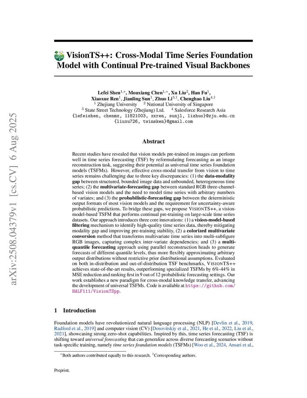 Recent studies have indicated that vision models pre-trained on images can serve as time series foundation models (TSFMs) by reformulating time series forecasting (TSF) as image reconstruction. However, effective cross-modal transfer from vision to time series remains challenging due to three discrepancies: (1) the data-modality gap between structured, bounded image data and unbounded, heterogeneous time series; (2) the multivariate-forecasting gap between fixed RGB-three-channel vision models and time series with arbitrary numbers of variates; and (3) the probabilistic-forecasting gap between the deterministic outputs of vision models and the requirement for uncertainty-aware probabilistic predictions. To bridge these gaps, we propose VisonTS++, a TSFM based on continual pre-training of a vision model on large-scale time series. Our approach introduces three key innovations: (1) vision-model-based filtering to identify high-quality sequences to stabilize pre-training and mitigate modality gap; (2) colorized multivariate conversion, encoding multivariate series as multi-subfigure RGB images to enhance cross-variate modeling; (3) multi-quantile forecasting, using parallel reconstruction heads to generate quantile forecasts without parametric assumptions. Experiments show that VisionTS++ achieves state-of-the-art performance in both in-distribution and out-of-distribution forecasting, outperforming specialized TSFMs by 6%-44% in MSE reduction and ranking first in GIFT-Eval benchmark which comprises 23 datasets across 7 domains. Our work demonstrates that with appropriate adaptation, vision models can effectively generalize to TSF, thus advancing the pursuit of universal TSFMs. Code is available atthis https URL.