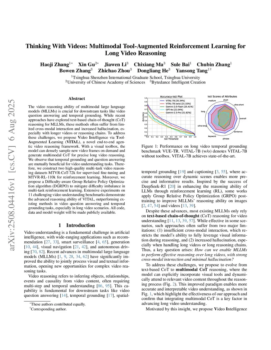 The video reasoning ability of multimodal large language models (MLLMs) is crucial for downstream tasks like video question answering and temporal grounding. While recent approaches have explored text-based chain-of-thought (CoT) reasoning for MLLMs, these methods often suffer from limited cross-modal interaction and increased hallucination, especially with longer videos or reasoning chains. To address these challenges, we propose Video Intelligence via Tool-Augmented Learning (VITAL), a novel end-to-end agentic video reasoning framework. With a visual toolbox, the model can densely sample new video frames on demand and generate multimodal CoT for precise long video reasoning. We observe that temporal grounding and question answering are mutually beneficial for video understanding tasks. Therefore, we construct two high-quality multi-task video reasoning datasets MTVR-CoT-72k for supervised fine-tuning and MTVR-RL-110k for reinforcement learning. Moreover, we propose a Difficulty-aware Group Relative Policy Optimization algorithm (DGRPO) to mitigate difficulty imbalance in multi-task reinforcement learning. Extensive experiments on 11 challenging video understanding benchmarks demonstrate the advanced reasoning ability of VITAL, outperforming existing methods in video question answering and temporal grounding tasks, especially in long video scenarios. All code, data and model weight will be made publicly available.