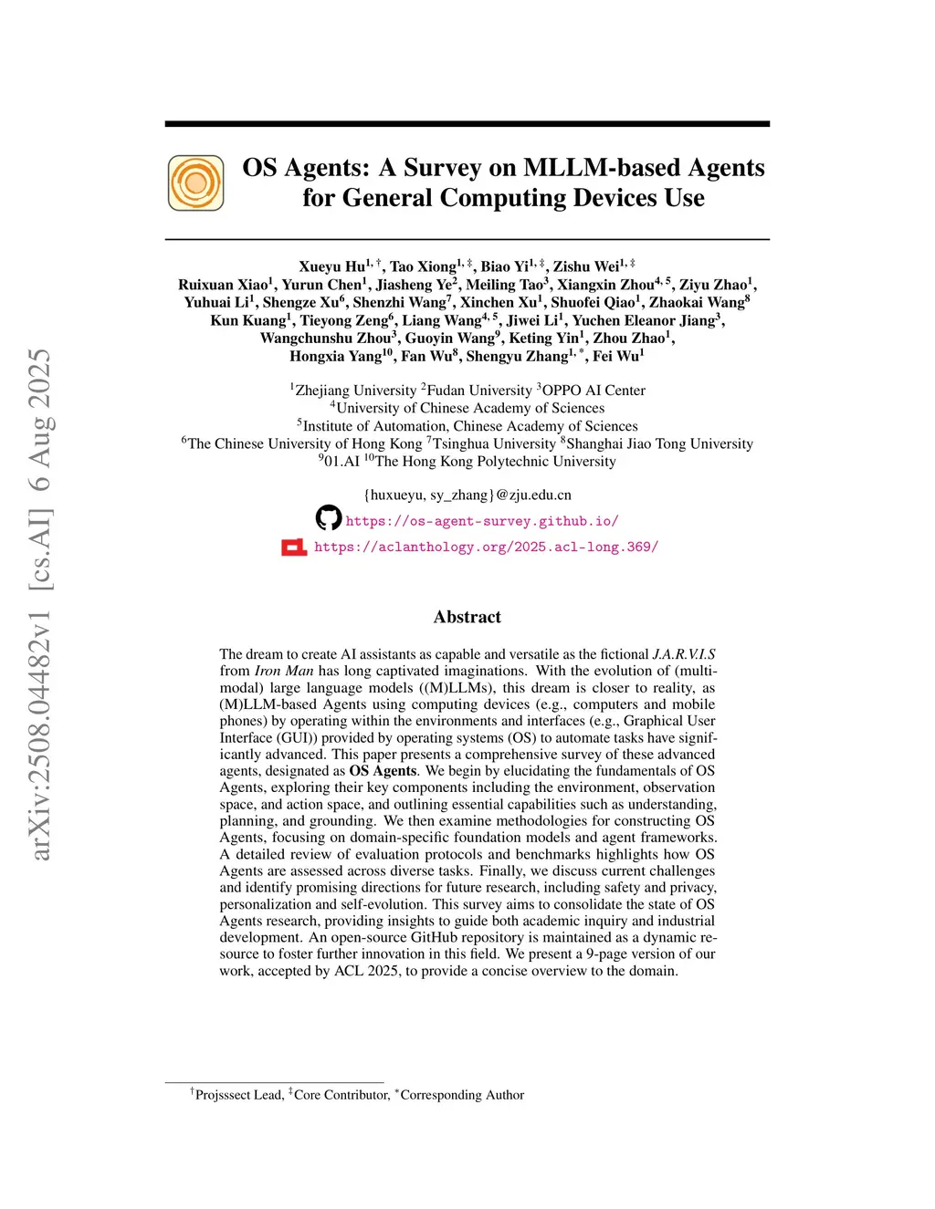 The dream to create AI assistants as capable and versatile as the fictional J.A.R.V.I.S from Iron Man has long captivated imaginations. With the evolution of (multi-modal) large language models ((M)LLMs), this dream is closer to reality, as (M)LLM-based Agents using computing devices (e.g., computers and mobile phones) by operating within the environments and interfaces (e.g., Graphical User Interface (GUI)) provided by operating systems (OS) to automate tasks have significantly advanced. This paper presents a comprehensive survey of these advanced agents, designated as OS Agents. We begin by elucidating the fundamentals of OS Agents, exploring their key components including the environment, observation space, and action space, and outlining essential capabilities such as understanding, planning, and grounding. We then examine methodologies for constructing OS Agents, focusing on domain-specific foundation models and agent frameworks. A detailed review of evaluation protocols and benchmarks highlights how OS Agents are assessed across diverse tasks. Finally, we discuss current challenges and identify promising directions for future research, including safety and privacy, personalization and self-evolution. This survey aims to consolidate the state of OS Agents research, providing insights to guide both academic inquiry and industrial development. An open-source GitHub repository is maintained as a dynamic resource to foster further innovation in this field. We present a 9-page version of our work, accepted by ACL 2025, to provide a concise overview to the domain.