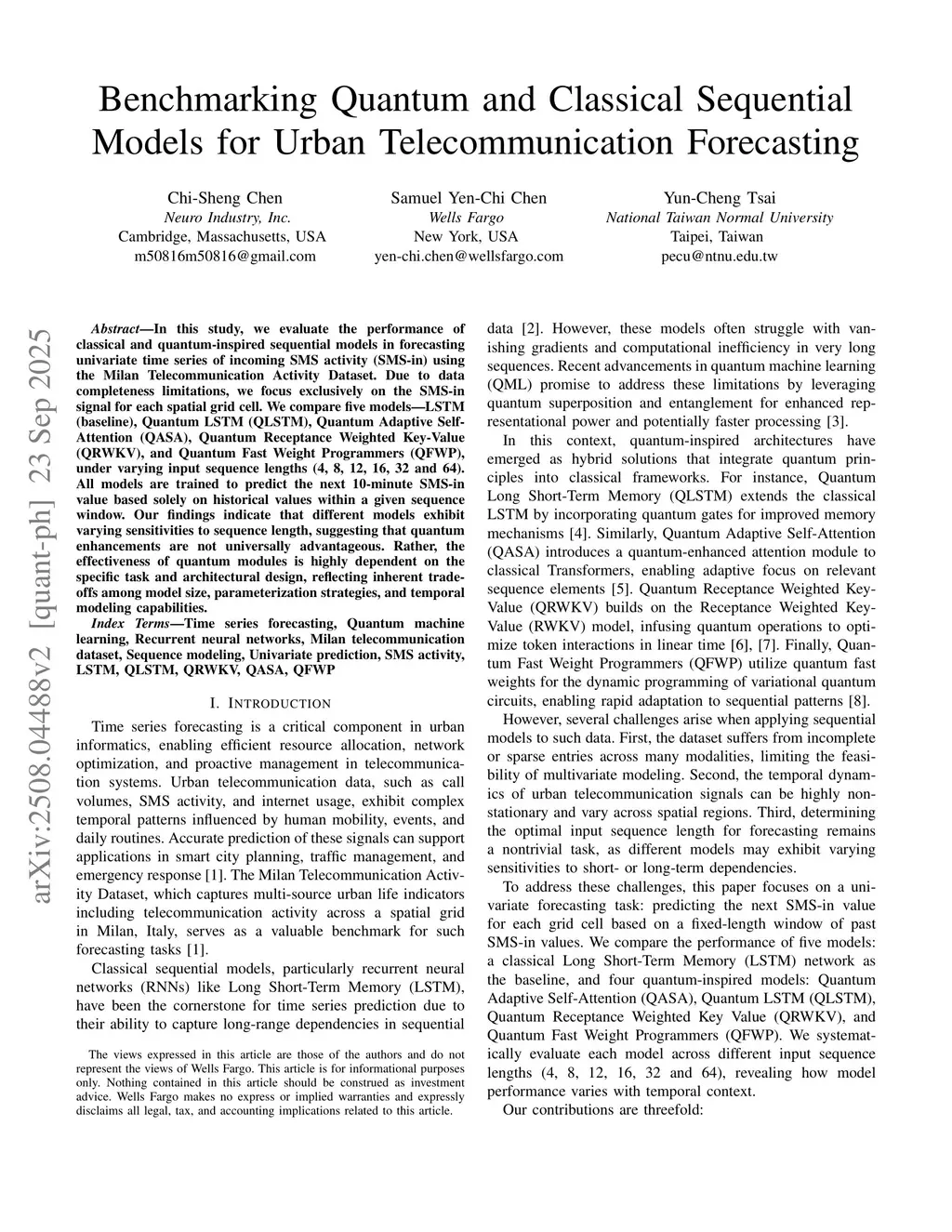 In this study, we evaluate the performance of classical and quantum-inspired sequential models in forecasting univariate time series of incoming SMS activity (SMS-in) using the Milan Telecommunication Activity Dataset. Due to data completeness limitations, we focus exclusively on the SMS-in signal for each spatial grid cell. We compare five models, LSTM (baseline), Quantum LSTM (QLSTM), Quantum Adaptive Self-Attention (QASA), Quantum Receptance Weighted Key-Value (QRWKV), and Quantum Fast Weight Programmers (QFWP), under varying input sequence lengths (4, 8, 12, 16, 32 and 64). All models are trained to predict the next 10-minute SMS-in value based solely on historical values within a given sequence window. Our findings indicate that different models exhibit varying sensitivities to sequence length, suggesting that quantum enhancements are not universally advantageous. Rather, the effectiveness of quantum modules is highly dependent on the specific task and architectural design, reflecting inherent trade-offs among model size, parameterization strategies, and temporal modeling capabilities.