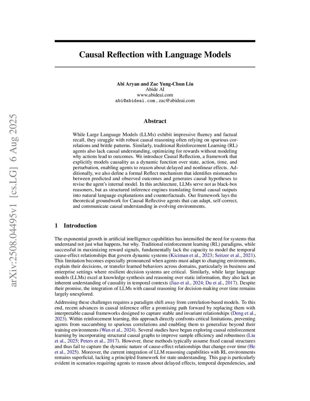 While LLMs exhibit impressive fluency and factual recall, they struggle with robust causal reasoning, often relying on spurious correlations and brittle patterns. Similarly, traditional Reinforcement Learning agents also lack causal understanding, optimizing for rewards without modeling why actions lead to outcomes. We introduce Causal Reflection, a framework that explicitly models causality as a dynamic function over state, action, time, and perturbation, enabling agents to reason about delayed and nonlinear effects. Additionally, we define a formal Reflect mechanism that identifies mismatches between predicted and observed outcomes and generates causal hypotheses to revise the agent's internal model. In this architecture, LLMs serve not as black-box reasoners, but as structured inference engines translating formal causal outputs into natural language explanations and counterfactuals. Our framework lays the theoretical groundwork for Causal Reflective agents that can adapt, self-correct, and communicate causal understanding in evolving environments.