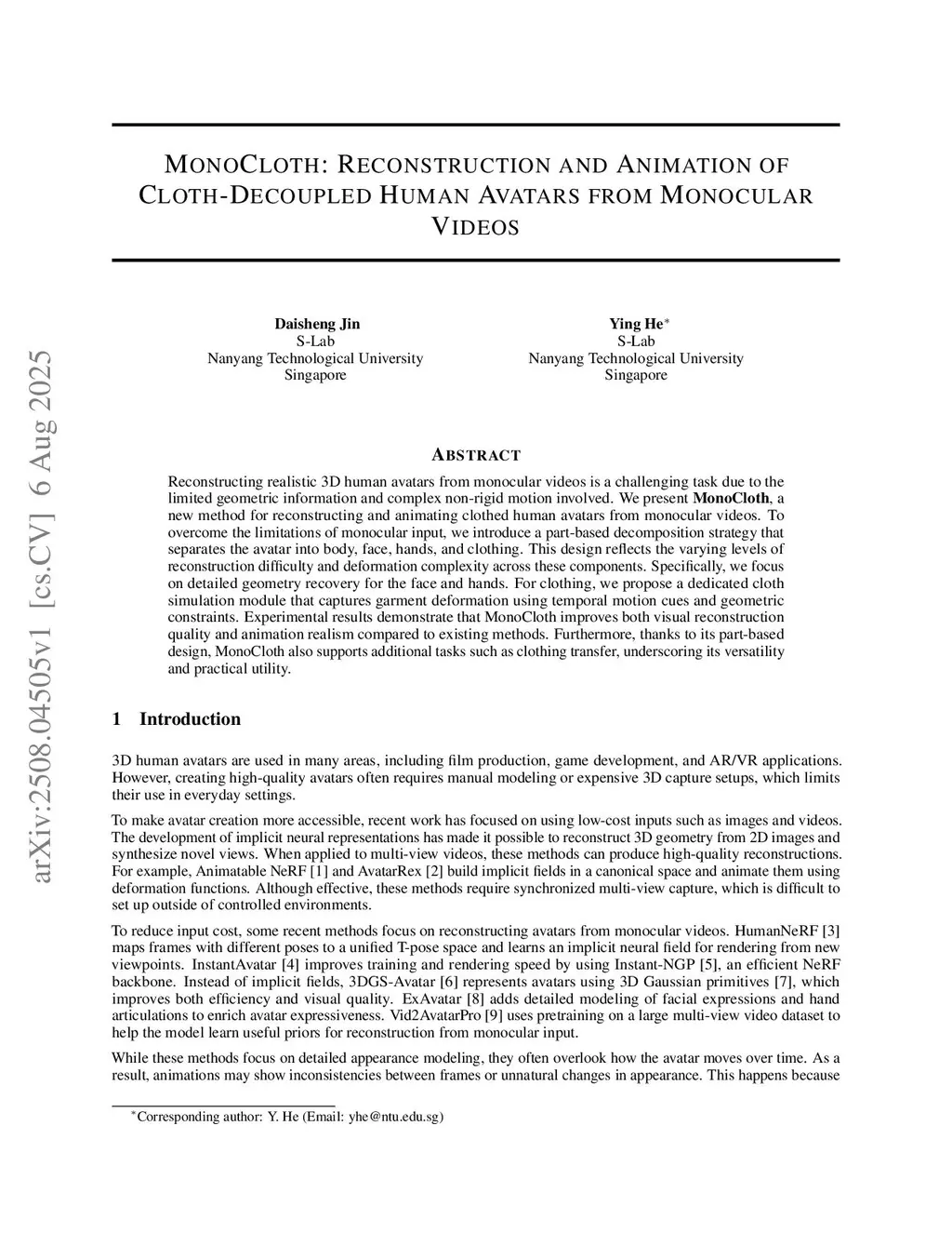 MonoCloth: Reconstruction and Animation of Cloth-Decoupled Human Avatars from Monocular Videos