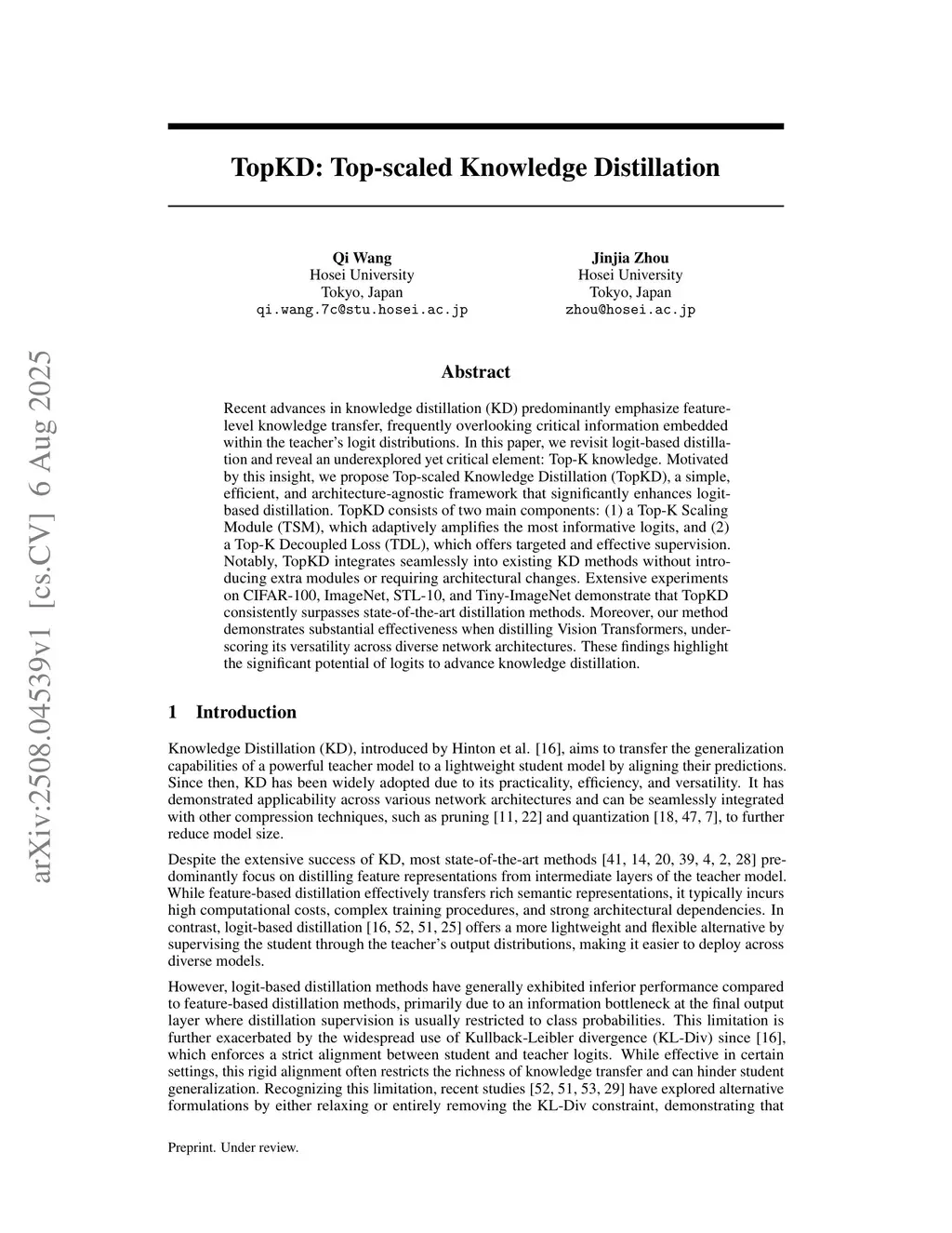 Recent advances in knowledge distillation (KD) predominantly emphasize feature-level knowledge transfer, frequently overlooking critical information embedded within the teacher's logit distributions. In this paper, we revisit logit-based distillation and reveal an underexplored yet critical element: Top-K knowledge. Motivated by this insight, we propose Top-scaled Knowledge Distillation (TopKD), a simple, efficient, and architecture-agnostic framework that significantly enhances logit-based distillation. TopKD consists of two main components: (1) a Top-K Scaling Module (TSM), which adaptively amplifies the most informative logits, and (2) a Top-K Decoupled Loss (TDL), which offers targeted and effective supervision. Notably, TopKD integrates seamlessly into existing KD methods without introducing extra modules or requiring architectural changes. Extensive experiments on CIFAR-100, ImageNet, STL-10, and Tiny-ImageNet demonstrate that TopKD consistently surpasses state-of-the-art distillation methods. Moreover, our method demonstrates substantial effectiveness when distilling Vision Transformers, underscoring its versatility across diverse network architectures. These findings highlight the significant potential of logits to advance knowledge distillation.