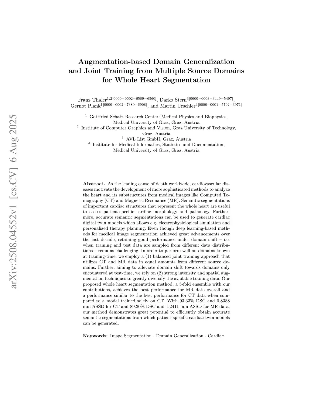 As the leading cause of death worldwide, cardiovascular diseases motivate the development of more sophisticated methods to analyze the heart and its substructures from medical images like Computed Tomography (CT) and Magnetic Resonance (MR). Semantic segmentations of important cardiac structures that represent the whole heart are useful to assess patient-specific cardiac morphology and pathology. Furthermore, accurate semantic segmentations can be used to generate cardiac digital twin models which allows e.g. electrophysiological simulation and personalized therapy planning. Even though deep learning-based methods for medical image segmentation achieved great advancements over the last decade, retaining good performance under domain shift -- i.e. when training and test data are sampled from different data distributions -- remains challenging. In order to perform well on domains known at training-time, we employ a (1) balanced joint training approach that utilizes CT and MR data in equal amounts from different source domains. Further, aiming to alleviate domain shift towards domains only encountered at test-time, we rely on (2) strong intensity and spatial augmentation techniques to greatly diversify the available training data. Our proposed whole heart segmentation method, a 5-fold ensemble with our contributions, achieves the best performance for MR data overall and a performance similar to the best performance for CT data when compared to a model trained solely on CT. With 93.33% DSC and 0.8388 mm ASSD for CT and 89.30% DSC and 1.2411 mm ASSD for MR data, our method demonstrates great potential to efficiently obtain accurate semantic segmentations from which patient-specific cardiac twin models can be generated.