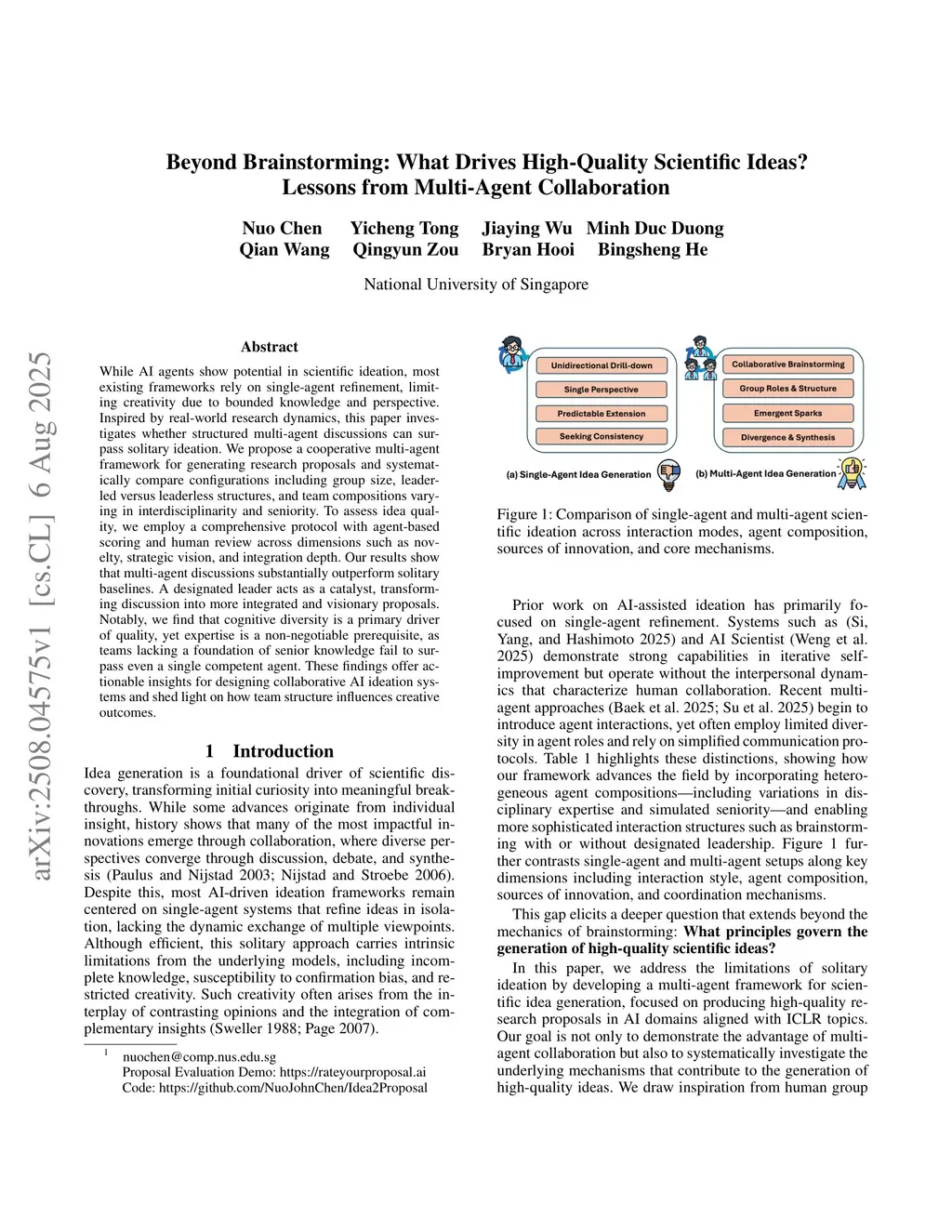 While AI agents show potential in scientific ideation, most existing frameworks rely on single-agent refinement, limiting creativity due to bounded knowledge and perspective. Inspired by real-world research dynamics, this paper investigates whether structured multi-agent discussions can surpass solitary ideation. We propose a cooperative multi-agent framework for generating research proposals and systematically compare configurations including group size, leaderled versus leaderless structures, and team compositions varying in interdisciplinarity and seniority. To assess idea quality, we employ a comprehensive protocol with agent-based scoring and human review across dimensions such as novelty, strategic vision, and integration depth. Our results show that multi-agent discussions substantially outperform solitary baselines. A designated leader acts as a catalyst, transforming discussion into more integrated and visionary proposals. Notably, we find that cognitive diversity is a primary driver of quality, yet expertise is a non-negotiable prerequisite, as teams lacking a foundation of senior knowledge fail to surpass even a single competent agent. These findings offer actionable insights for designing collaborative AI ideation systems and shed light on how team structure influences creative outcomes.