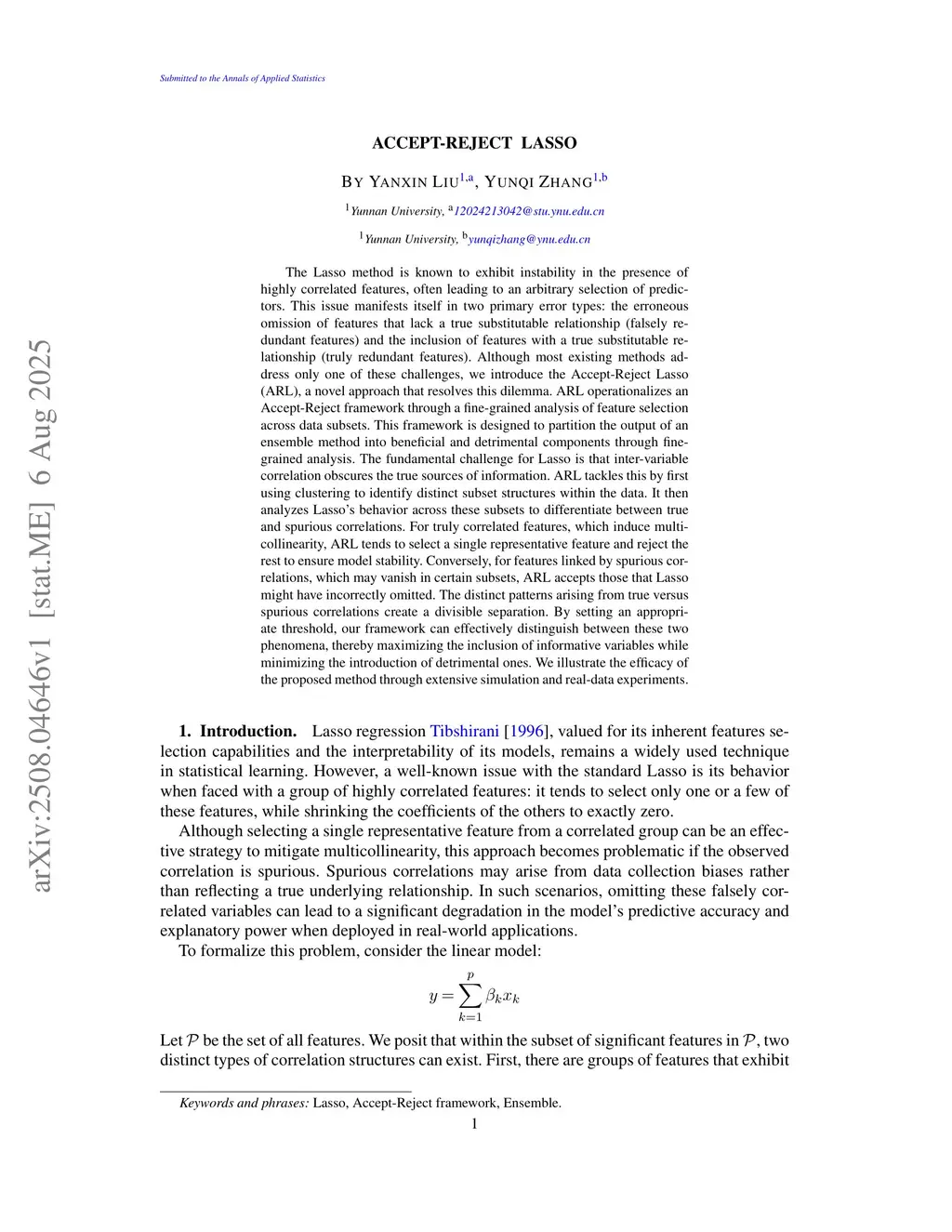 The Lasso method is known to exhibit instability in the presence of highly correlated features, often leading to an arbitrary selection of predictors. This issue manifests itself in two primary error types: the erroneous omission of features that lack a true substitutable relationship (falsely redundant features) and the inclusion of features with a true substitutable relationship (truly redundant features). Although most existing methods address only one of these challenges, we introduce the Accept-Reject Lasso (ARL), a novel approach that resolves this dilemma. ARL operationalizes an Accept-Reject framework through a fine-grained analysis of feature selection across data subsets. This framework is designed to partition the output of an ensemble method into beneficial and detrimental components through fine-grained analysis. The fundamental challenge for Lasso is that inter-variable correlation obscures the true sources of information. ARL tackles this by first using clustering to identify distinct subset structures within the data. It then analyzes Lasso's behavior across these subsets to differentiate between true and spurious correlations. For truly correlated features, which induce multicollinearity, ARL tends to select a single representative feature and reject the rest to ensure model stability. Conversely, for features linked by spurious correlations, which may vanish in certain subsets, ARL accepts those that Lasso might have incorrectly omitted. The distinct patterns arising from true versus spurious correlations create a divisible separation. By setting an appropriate threshold, our framework can effectively distinguish between these two phenomena, thereby maximizing the inclusion of informative variables while minimizing the introduction of detrimental ones. We illustrate the efficacy of the proposed method through extensive simulation and real-data experiments.