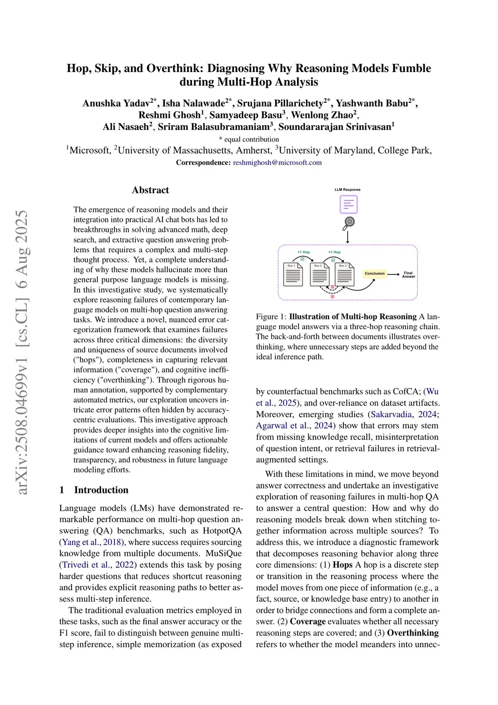 The emergence of reasoning models and their integration into practical AI chat bots has led to breakthroughs in solving advanced math, deep search, and extractive question answering problems that requires a complex and multi-step thought process. Yet, a complete understanding of why these models hallucinate more than general purpose language models is missing. In this investigative study, we systematicallyexplore reasoning failures of contemporary language models on multi-hop question answering tasks. We introduce a novel, nuanced error categorization framework that examines failures across three critical dimensions: the diversity and uniqueness of source documents involved ("hops"), completeness in capturing relevant information ("coverage"), and cognitive inefficiency ("overthinking"). Through rigorous hu-man annotation, supported by complementary automated metrics, our exploration uncovers intricate error patterns often hidden by accuracy-centric evaluations. This investigative approach provides deeper insights into the cognitive limitations of current models and offers actionable guidance toward enhancing reasoning fidelity, transparency, and robustness in future language modeling efforts.