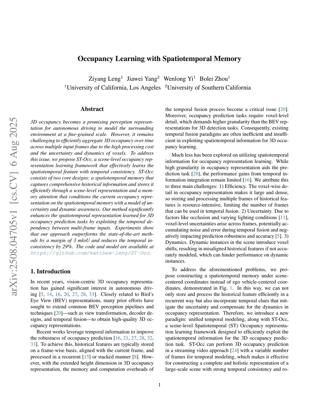 3D occupancy becomes a promising perception representation for autonomous driving to model the surrounding environment at a fine-grained scale. However, it remains challenging to efficiently aggregate 3D occupancy over time across multiple input frames due to the high processing cost and the uncertainty and dynamics of voxels. To address this issue, we propose ST-Occ, a scene-level occupancy representation learning framework that effectively learns the spatiotemporal feature with temporal consistency. ST-Occ consists of two core designs: a spatiotemporal memory that captures comprehensive historical information and stores it efficiently through a scene-level representation and a memory attention that conditions the current occupancy representation on the spatiotemporal memory with a model of uncertainty and dynamic awareness. Our method significantly enhances the spatiotemporal representation learned for 3D occupancy prediction tasks by exploiting the temporal dependency between multi-frame inputs. Experiments show that our approach outperforms the state-of-the-art methods by a margin of 3 mIoU and reduces the temporal inconsistency by 29%.