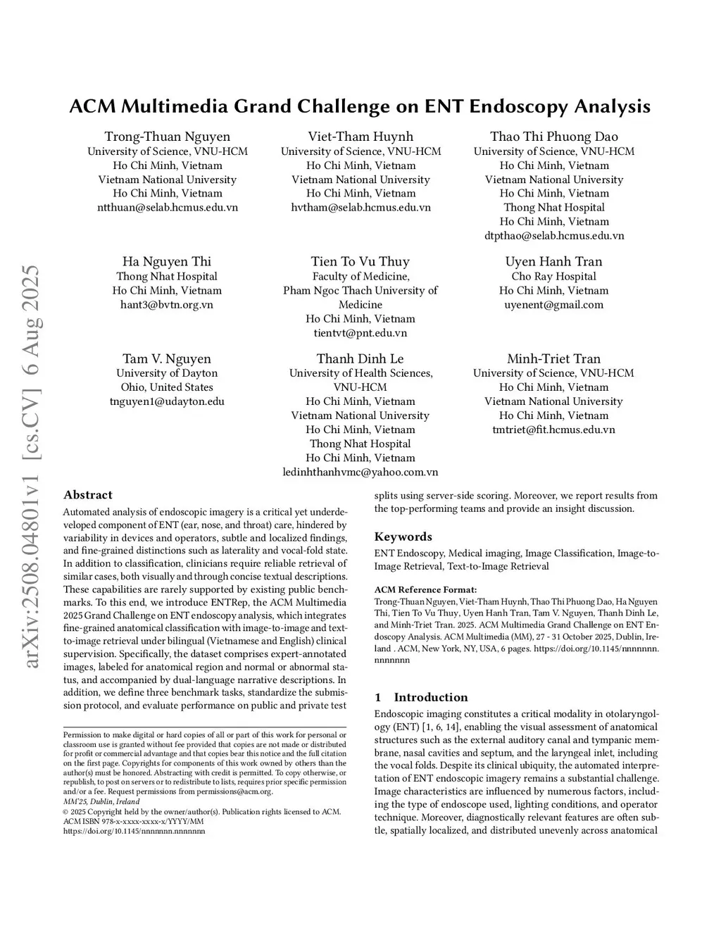 Automated analysis of endoscopic imagery is a critical yet underdeveloped component of ENT (ear, nose, and throat) care, hindered by variability in devices and operators, subtle and localized findings, and fine-grained distinctions such as laterality and vocal-fold state. In addition to classification, clinicians require reliable retrieval of similar cases, both visually and through concise textual descriptions. These capabilities are rarely supported by existing public benchmarks. To this end, we introduce ENTRep, the ACM Multimedia 2025 Grand Challenge on ENT endoscopy analysis, which integrates fine-grained anatomical classification with image-to-image and text-to-image retrieval under bilingual (Vietnamese and English) clinical supervision. Specifically, the dataset comprises expert-annotated images, labeled for anatomical region and normal or abnormal status, and accompanied by dual-language narrative descriptions. In addition, we define three benchmark tasks, standardize the submission protocol, and evaluate performance on public and private test splits using server-side scoring. Moreover, we report results from the top-performing teams and provide an insight discussion.