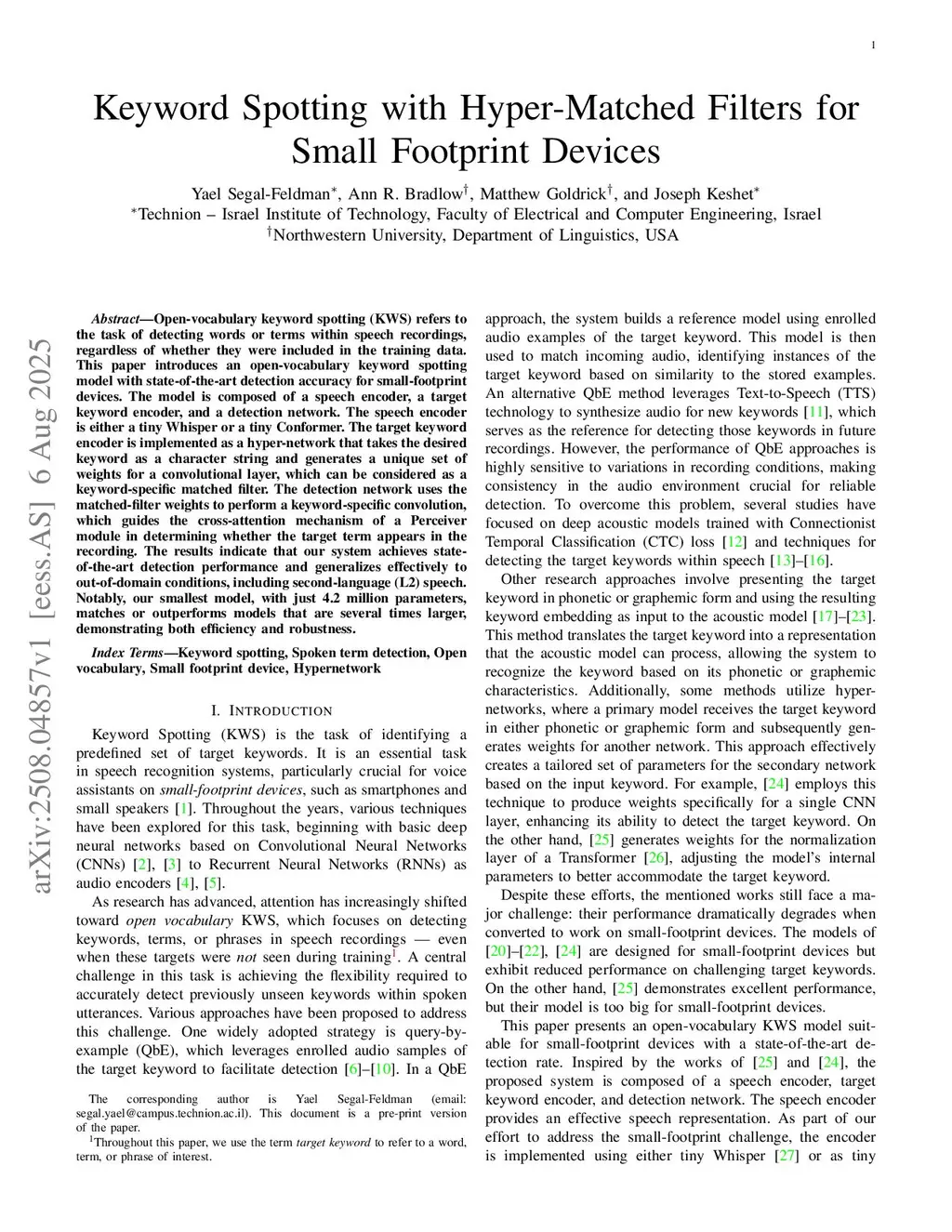 Open-vocabulary keyword spotting (KWS) refers to the task of detecting words or terms within speech recordings, regardless of whether they were included in the training data. This paper introduces an open-vocabulary keyword spotting model with state-of-the-art detection accuracy for small-footprint devices. The model is composed of a speech encoder, a target keyword encoder, and a detection network. The speech encoder is either a tiny Whisper or a tiny Conformer. The target keyword encoder is implemented as a hyper-network that takes the desired keyword as a character string and generates a unique set of weights for a convolutional layer, which can be considered as a keyword-specific matched filter. The detection network uses the matched-filter weights to perform a keyword-specific convolution, which guides the cross-attention mechanism of a Perceiver module in determining whether the target term appears in the recording. The results indicate that our system achieves state-of-the-art detection performance and generalizes effectively to out-of-domain conditions, including second-language (L2) speech. Notably, our smallest model, with just 4.2 million parameters, matches or outperforms models that are several times larger, demonstrating both efficiency and robustness.