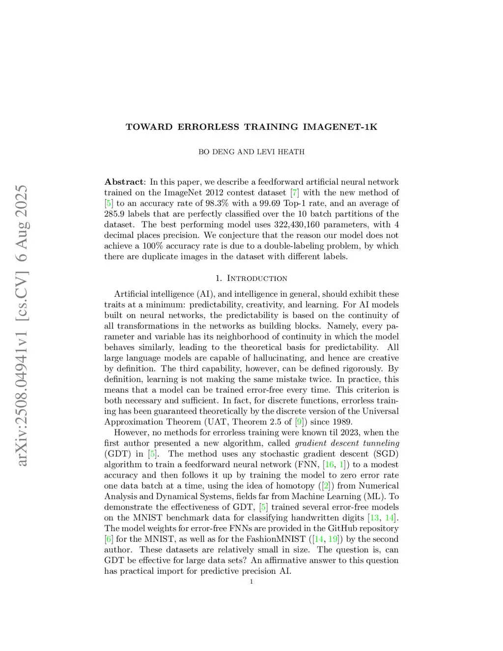 In this paper, we describe a feedforward artificial neural network trained on the ImageNet 2012 contest dataset [7] with the new method of [5] to an accuracy rate of 98.3% with a 99.69 Top-1 rate, and an average of 285.9 labels that are perfectly classified over the 10 batch partitions of the dataset. The best performing model uses 322,430,160 parameters, with 4 decimal places precision. We conjecture that the reason our model does not achieve a 100% accuracy rate is due to a double-labeling problem, by which there are duplicate images in the dataset with different labels.