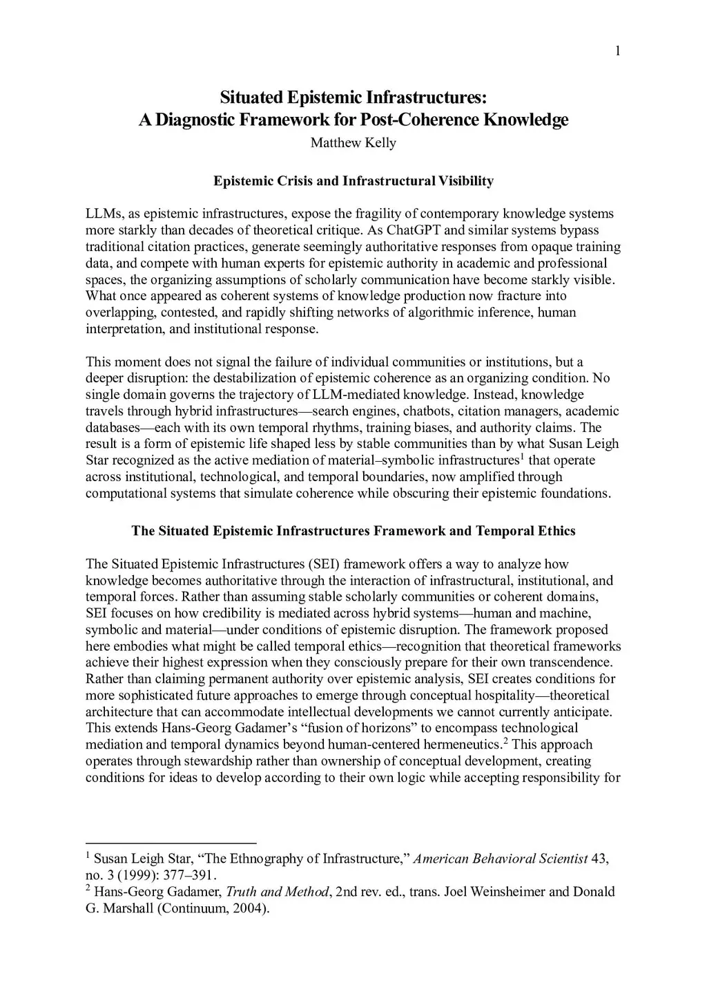 Large Language Models (LLMs) such as ChatGPT have rendered visible the fragility of contemporary knowledge infrastructures by simulating coherence while bypassing traditional modes of citation, authority, and validation. This paper introduces the Situated Epistemic Infrastructures (SEI) framework as a diagnostic tool for analyzing how knowledge becomes authoritative across hybrid human-machine systems under post-coherence conditions. Rather than relying on stable scholarly domains or bounded communities of practice, SEI traces how credibility is mediated across institutional, computational, and temporal arrangements. Integrating insights from infrastructure studies, platform theory, and epistemology, the framework foregrounds coordination over classification, emphasizing the need for anticipatory and adaptive models of epistemic stewardship. The paper contributes to debates on AI governance, knowledge production, and the ethical design of information systems by offering a robust alternative to representationalist models of scholarly communication.