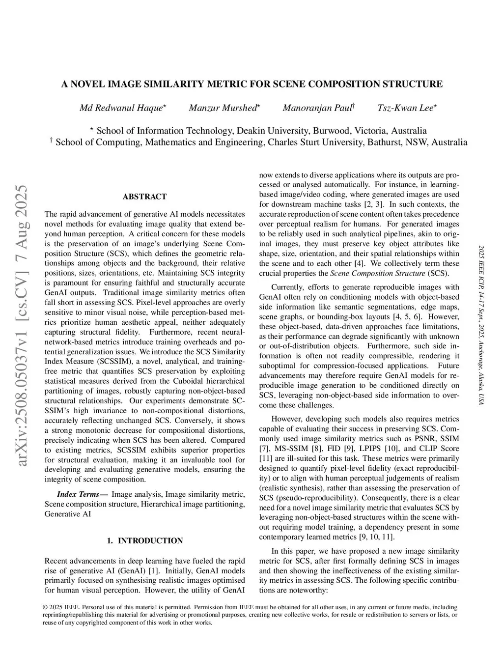 The rapid advancement of generative AI models necessitates novel methods for evaluating image quality that extend beyond human perception. A critical concern for these models is the preservation of an image's underlying Scene Composition Structure (SCS), which defines the geometric relationships among objects and the background, their relative positions, sizes, orientations, etc. Maintaining SCS integrity is paramount for ensuring faithful and structurally accurate GenAI outputs. Traditional image similarity metrics often fall short in assessing SCS. Pixel-level approaches are overly sensitive to minor visual noise, while perception-based metrics prioritize human aesthetic appeal, neither adequately capturing structural fidelity. Furthermore, recent neural-network-based metrics introduce training overheads and potential generalization issues. We introduce the SCS Similarity Index Measure (SCSSIM), a novel, analytical, and training-free metric that quantifies SCS preservation by exploiting statistical measures derived from the Cuboidal hierarchical partitioning of images, robustly capturing non-object-based structural relationships. Our experiments demonstrate SCSSIM's high invariance to non-compositional distortions, accurately reflecting unchanged SCS. Conversely, it shows a strong monotonic decrease for compositional distortions, precisely indicating when SCS has been altered. Compared to existing metrics, SCSSIM exhibits superior properties for structural evaluation, making it an invaluable tool for developing and evaluating generative models, ensuring the integrity of scene composition.