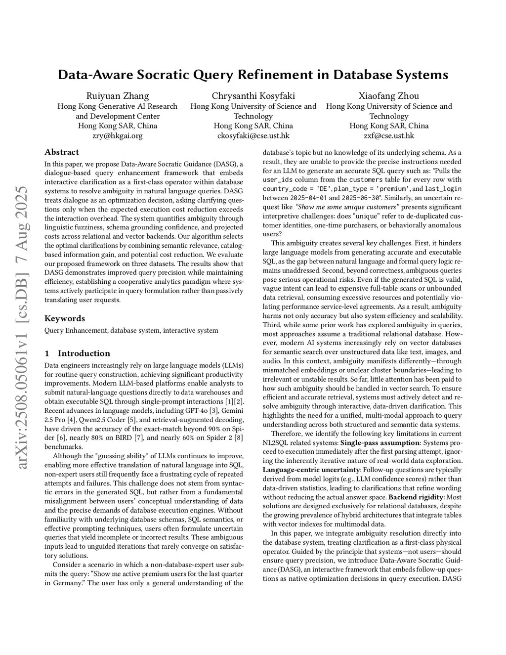In this paper, we propose Data-Aware Socratic Guidance (DASG), a dialogue-based query enhancement framework that embeds \linebreak interactive clarification as a first-class operator within database systems to resolve ambiguity in natural language queries. DASG treats dialogue as an optimization decision, asking clarifying questions only when the expected execution cost reduction exceeds the interaction overhead. The system quantifies ambiguity through linguistic fuzziness, schema grounding confidence, and projected costs across relational and vector backends. Our algorithm selects the optimal clarifications by combining semantic relevance, catalog-based information gain, and potential cost reduction. We evaluate our proposed framework on three datasets. The results show that DASG demonstrates improved query precision while maintaining efficiency, establishing a cooperative analytics paradigm where systems actively participate in query formulation rather than passively translating user requests.