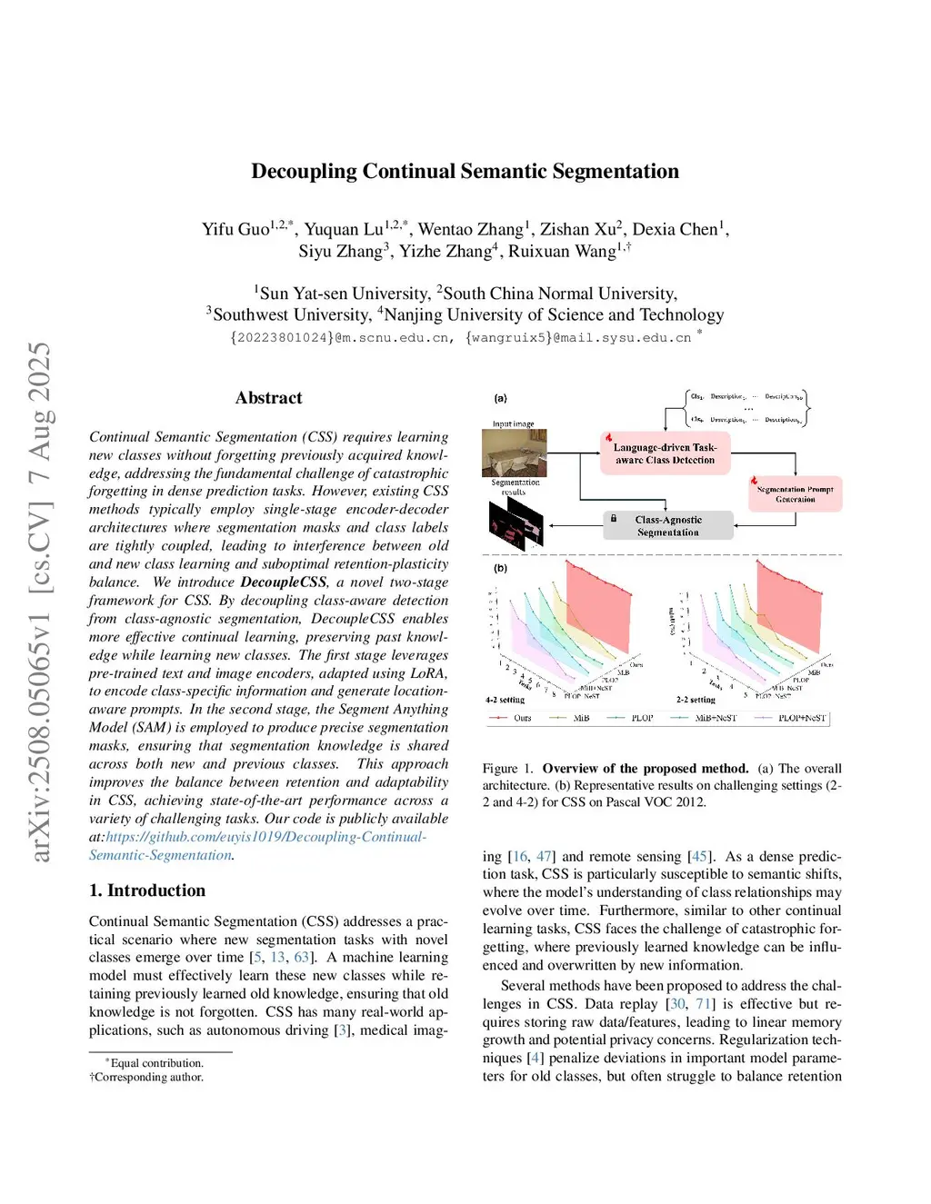 Continual Semantic Segmentation (CSS) requires learning new classes without forgetting previously acquired knowledge, addressing the fundamental challenge of catastrophic forgetting in dense prediction tasks. However, existing CSS methods typically employ single-stage encoder-decoder architectures where segmentation masks and class labels are tightly coupled, leading to interference between old and new class learning and suboptimal retention-plasticity balance. We introduce DecoupleCSS, a novel two-stage framework for CSS. By decoupling class-aware detection from class-agnostic segmentation, DecoupleCSS enables more effective continual learning, preserving past knowledge while learning new classes. The first stage leverages pre-trained text and image encoders, adapted using LoRA, to encode class-specific information and generate location-aware prompts. In the second stage, the Segment Anything Model (SAM) is employed to produce precise segmentation masks, ensuring that segmentation knowledge is shared across both new and previous classes. This approach improves the balance between retention and adaptability in CSS, achieving state-of-the-art performance across a variety of challenging tasks. Our code is publicly available at:this https URL.