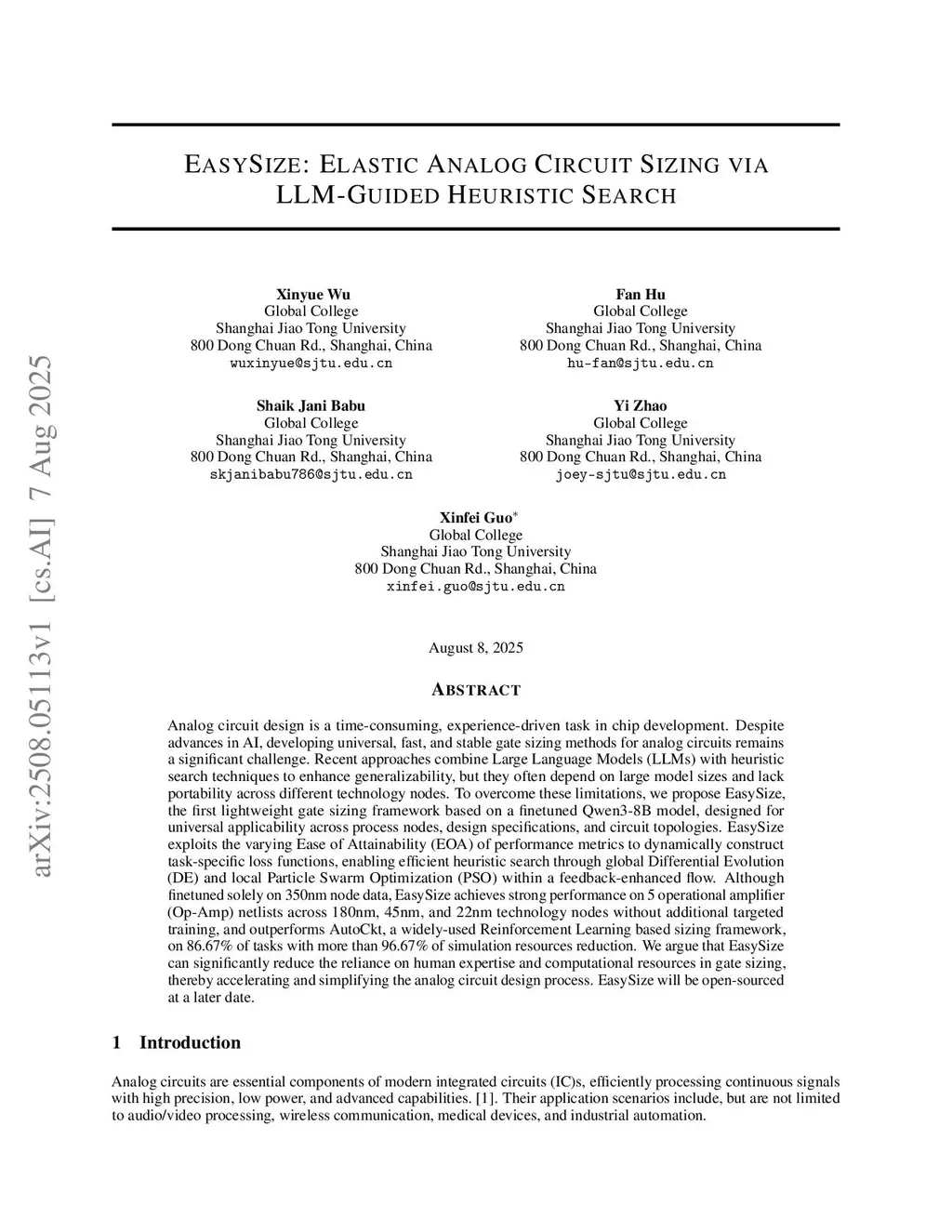 Analog circuit design is a time-consuming, experience-driven task in chip development. Despite advances in AI, developing universal, fast, and stable gate sizing methods for analog circuits remains a significant challenge. Recent approaches combine Large Language Models (LLMs) with heuristic search techniques to enhance generalizability, but they often depend on large model sizes and lack portability across different technology nodes. To overcome these limitations, we propose EasySize, the first lightweight gate sizing framework based on a finetuned Qwen3-8B model, designed for universal applicability across process nodes, design specifications, and circuit topologies. EasySize exploits the varying Ease of Attainability (EOA) of performance metrics to dynamically construct task-specific loss functions, enabling efficient heuristic search through global Differential Evolution (DE) and local Particle Swarm Optimization (PSO) within a feedback-enhanced flow. Although finetuned solely on 350nm node data, EasySize achieves strong performance on 5 operational amplifier (Op-Amp) netlists across 180nm, 45nm, and 22nm technology nodes without additional targeted training, and outperforms AutoCkt, a widely-used Reinforcement Learning based sizing framework, on 86.67\% of tasks with more than 96.67\% of simulation resources reduction. We argue that EasySize can significantly reduce the reliance on human expertise and computational resources in gate sizing, thereby accelerating and simplifying the analog circuit design process. EasySize will be open-sourced at a later date.