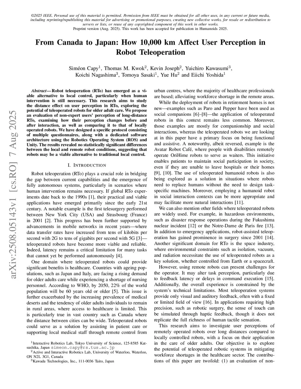 From Canada to Japan: How 10,000 km Affect User Perception in Robot Teleoperation