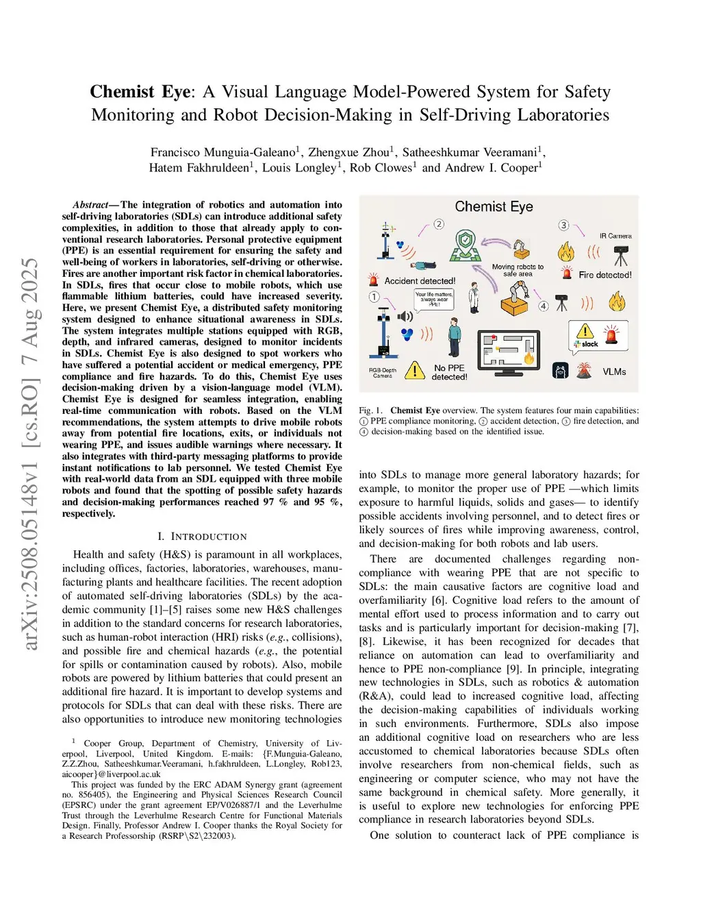 The integration of robotics and automation into self-driving laboratories (SDLs) can introduce additional safety complexities, in addition to those that already apply to conventional research laboratories. Personal protective equipment (PPE) is an essential requirement for ensuring the safety and well-being of workers in laboratories, self-driving or otherwise. Fires are another important risk factor in chemical laboratories. In SDLs, fires that occur close to mobile robots, which use flammable lithium batteries, could have increased severity. Here, we present Chemist Eye, a distributed safety monitoring system designed to enhance situational awareness in SDLs. The system integrates multiple stations equipped with RGB, depth, and infrared cameras, designed to monitor incidents in SDLs. Chemist Eye is also designed to spot workers who have suffered a potential accident or medical emergency, PPE compliance and fire hazards. To do this, Chemist Eye uses decision-making driven by a vision-language model (VLM). Chemist Eye is designed for seamless integration, enabling real-time communication with robots. Based on the VLM recommendations, the system attempts to drive mobile robots away from potential fire locations, exits, or individuals not wearing PPE, and issues audible warnings where necessary. It also integrates with third-party messaging platforms to provide instant notifications to lab personnel. We tested Chemist Eye with real-world data from an SDL equipped with three mobile robots and found that the spotting of possible safety hazards and decision-making performances reached 97 % and 95 %, respectively.