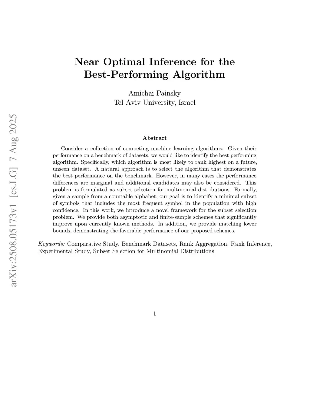 Consider a collection of competing machine learning algorithms. Given their performance on a benchmark of datasets, we would like to identify the best performing algorithm. Specifically, which algorithm is most likely to rank highest on a future, unseen dataset. A natural approach is to select the algorithm that demonstrates the best performance on the benchmark. However, in many cases the performance differences are marginal and additional candidates may also be considered. This problem is formulated as subset selection for multinomial distributions. Formally, given a sample from a countable alphabet, our goal is to identify a minimal subset of symbols that includes the most frequent symbol in the population with high confidence. In this work, we introduce a novel framework for the subset selection problem. We provide both asymptotic and finite-sample schemes that significantly improve upon currently known methods. In addition, we provide matching lower bounds, demonstrating the favorable performance of our proposed schemes.