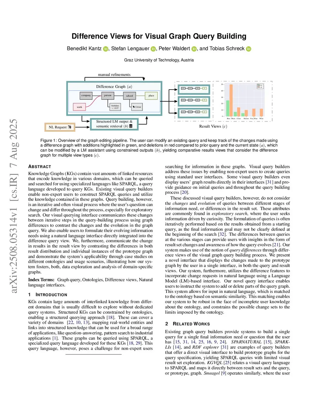 Knowledge Graphs (KGs) contain vast amounts of linked resources that encode knowledge in various domains, which can be queried and searched for using specialized languages like SPARQL, a query language developed to query KGs. Existing visual query builders enable non-expert users to construct SPARQL queries and utilize the knowledge contained in these graphs. Query building is, however, an iterative and, often, visual process where the question of the user can change and differ throughout the process, especially for explorative search. Our visual querying interface communicates these change between iterative steps in the query building process using graph differences to contrast the changes and the evolution in the graph query. We also enable users to formulate their evolving information needs using a natural language interface directly integrated into the difference query view. We, furthermore, communicate the change in results in the result view by contrasting the differences in both result distribution and individual instances of the prototype graph and demonstrate the system's applicability through case studies on different ontologies and usage scenarios, illustrating how our system fosters, both, data exploration and analysis of domain-specific graphs.