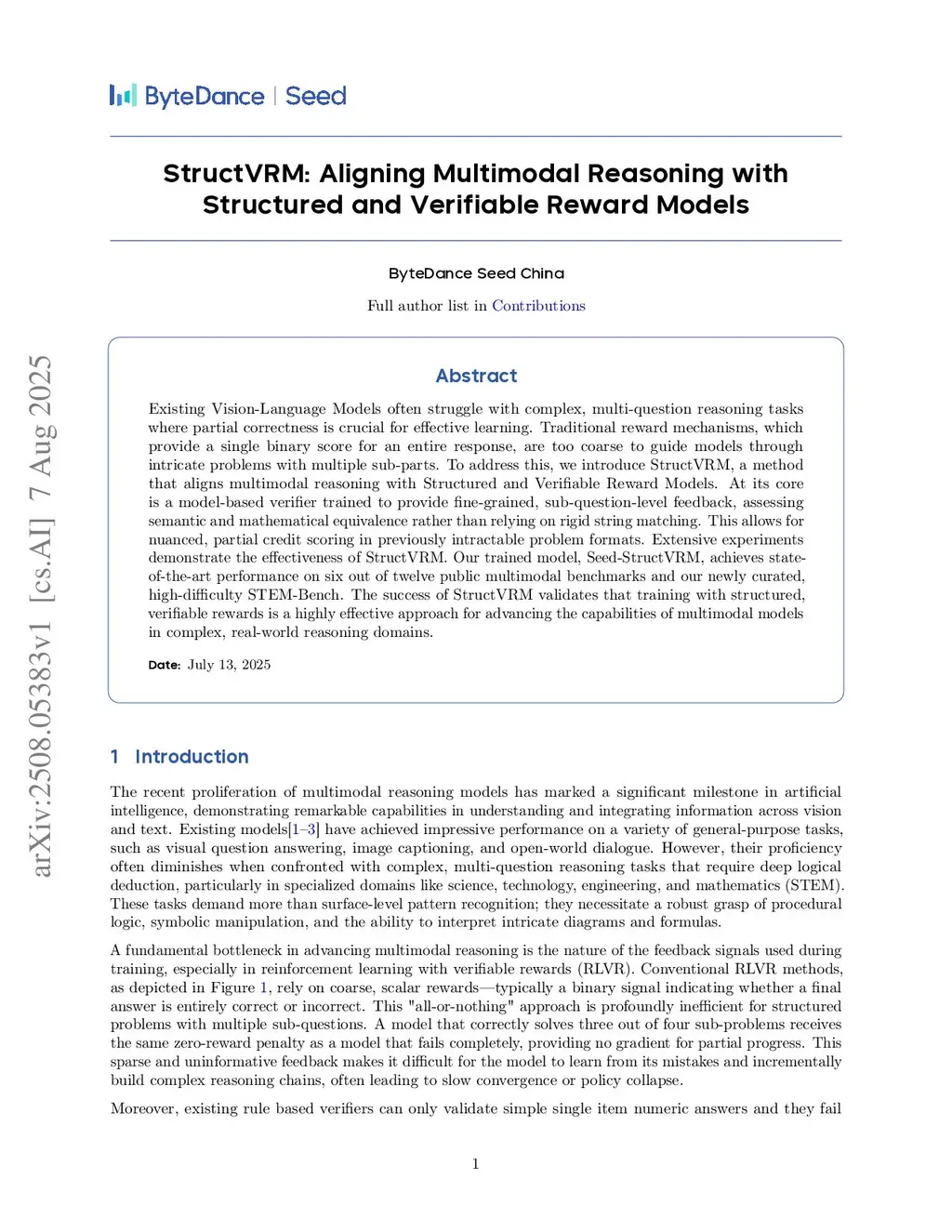 Existing Vision-Language Models often struggle with complex, multi-question reasoning tasks where partial correctness is crucial for effective learning. Traditional reward mechanisms, which provide a single binary score for an entire response, are too coarse to guide models through intricate problems with multiple sub-parts. To address this, we introduce StructVRM, a method that aligns multimodal reasoning with Structured and Verifiable Reward Models. At its core is a model-based verifier trained to provide fine-grained, sub-question-level feedback, assessing semantic and mathematical equivalence rather than relying on rigid string matching. This allows for nuanced, partial credit scoring in previously intractable problem formats. Extensive experiments demonstrate the effectiveness of StructVRM. Our trained model, Seed-StructVRM, achieves state-of-the-art performance on six out of twelve public multimodal benchmarks and our newly curated, high-difficulty STEM-Bench. The success of StructVRM validates that training with structured, verifiable rewards is a highly effective approach for advancing the capabilities of multimodal models in complex, real-world reasoning domains.