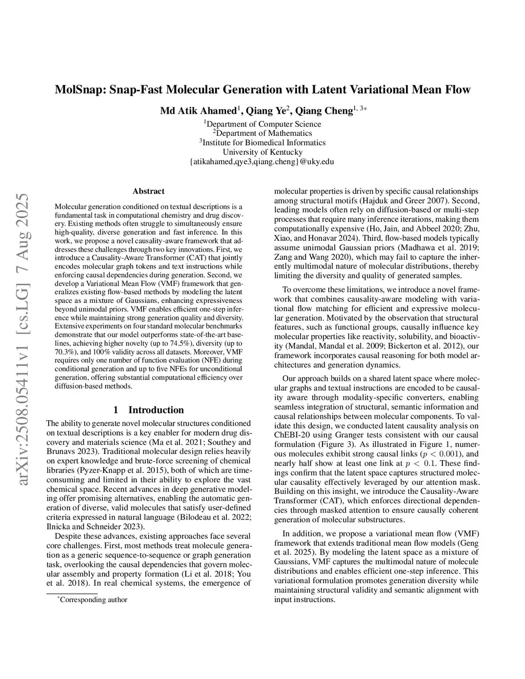 Molecular generation conditioned on textual descriptions is a fundamental task in computational chemistry and drug discovery. Existing methods often struggle to simultaneously ensure high-quality, diverse generation and fast inference. In this work, we propose a novel causality-aware framework that addresses these challenges through two key innovations. First, we introduce a Causality-Aware Transformer (CAT) that jointly encodes molecular graph tokens and text instructions while enforcing causal dependencies during generation. Second, we develop a Variational Mean Flow (VMF) framework that generalizes existing flow-based methods by modeling the latent space as a mixture of Gaussians, enhancing expressiveness beyond unimodal priors. VMF enables efficient one-step inference while maintaining strong generation quality and diversity. Extensive experiments on four standard molecular benchmarks demonstrate that our model outperforms state-of-the-art baselines, achieving higher novelty (up to 74.5\%), diversity (up to 70.3\%), and 100\% validity across all datasets. Moreover, VMF requires only one number of function evaluation (NFE) during conditional generation and up to five NFEs for unconditional generation, offering substantial computational efficiency over diffusion-based methods.