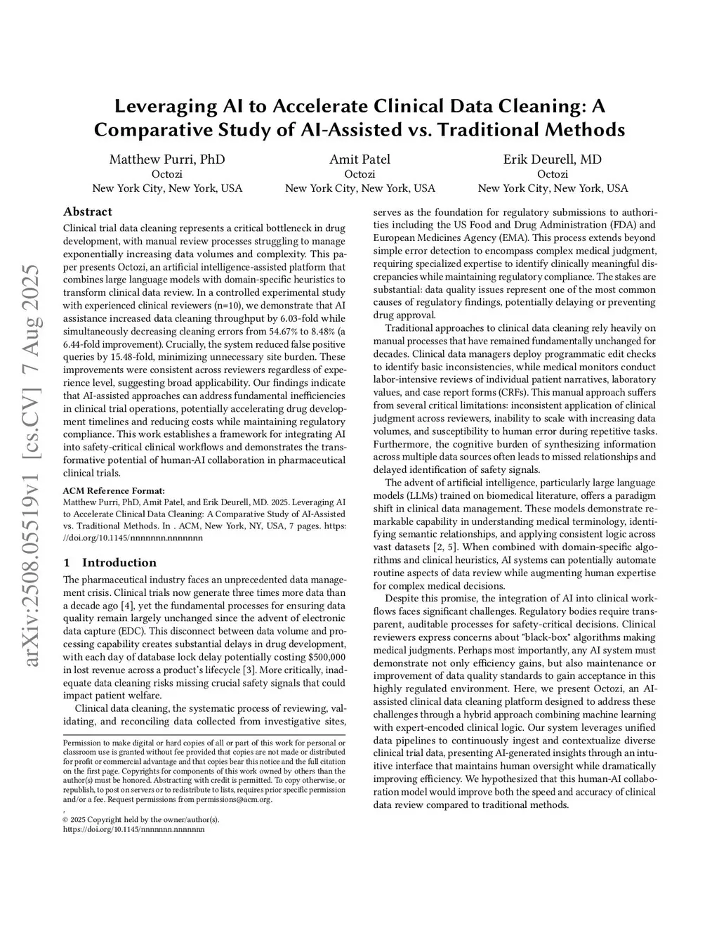 Clinical trial data cleaning represents a critical bottleneck in drug development, with manual review processes struggling to manage exponentially increasing data volumes and complexity. This paper presents Octozi, an artificial intelligence-assisted platform that combines large language models with domain-specific heuristics to transform medical data review. In a controlled experimental study with experienced medical reviewers (n=10), we demonstrate that AI assistance increased data cleaning throughput by 6.03-fold while simultaneously decreasing cleaning errors from 54.67% to 8.48% (a 6.44-fold improvement). Crucially, the system reduced false positive queries by 15.48-fold, minimizing unnecessary site burden. Economic analysis of a representative Phase III oncology trial reveals potential cost savings of $5.1 million, primarily driven by accelerated database lock timelines (5-day reduction saving 420K savings), and reduced query management burden ($288K savings). These improvements were consistent across reviewers regardless of experience level, suggesting broad applicability. Our findings indicate that AI-assisted approaches can address fundamental inefficiencies in clinical trial operations, potentially accelerating drug development timelines such as database lock by 33% while maintaining regulatory compliance and significantly reducing operational costs. This work establishes a framework for integrating AI into safety-critical clinical workflows and demonstrates the transformative potential of human-AI collaboration in pharmaceutical clinical trials.