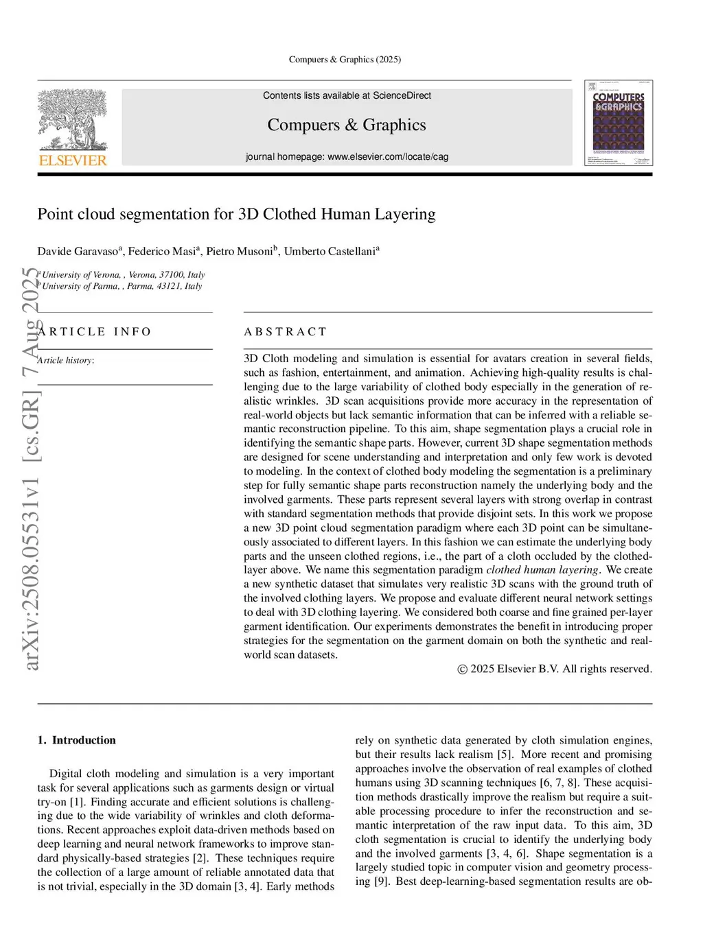 3D Cloth modeling and simulation is essential for avatars creation in several fields, such as fashion, entertainment, and animation. Achieving high-quality results is challenging due to the large variability of clothed body especially in the generation of realistic wrinkles. 3D scan acquisitions provide more accuracy in the representation of real-world objects but lack semantic information that can be inferred with a reliable semantic reconstruction pipeline. To this aim, shape segmentation plays a crucial role in identifying the semantic shape parts. However, current 3D shape segmentation methods are designed for scene understanding and interpretation and only few work is devoted to modeling. In the context of clothed body modeling the segmentation is a preliminary step for fully semantic shape parts reconstruction namely the underlying body and the involved garments. These parts represent several layers with strong overlap in contrast with standard segmentation methods that provide disjoint sets. In this work we propose a new 3D point cloud segmentation paradigm where each 3D point can be simultaneously associated to different layers. In this fashion we can estimate the underlying body parts and the unseen clothed regions, i.e., the part of a cloth occluded by the clothed-layer above. We name this segmentation paradigm clothed human layering. We create a new synthetic dataset that simulates very realistic 3D scans with the ground truth of the involved clothing layers. We propose and evaluate different neural network settings to deal with 3D clothing layering. We considered both coarse and fine grained per-layer garment identification. Our experiments demonstrates the benefit in introducing proper strategies for the segmentation on the garment domain on both the synthetic and real-world scan datasets.