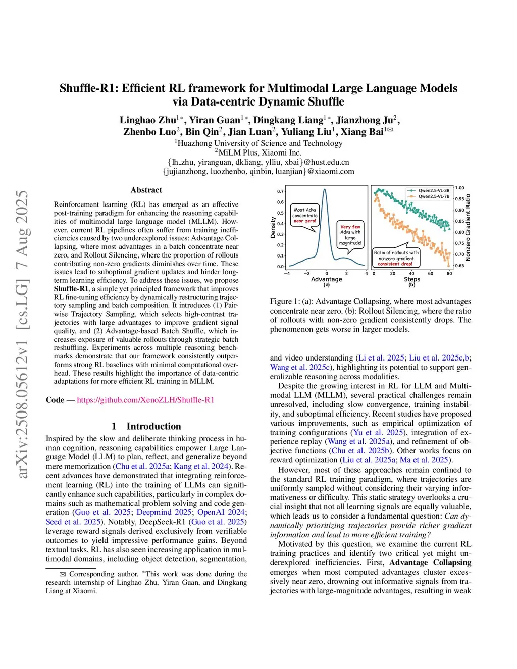 Reinforcement learning (RL) has emerged as an effective post-training paradigm for enhancing the reasoning capabilities of multimodal large language model (MLLM). However, current RL pipelines often suffer from training inefficiencies caused by two underexplored issues: Advantage Collapsing, where most advantages in a batch concentrate near zero, and Rollout Silencing, where the proportion of rollouts contributing non-zero gradients diminishes over time. These issues lead to suboptimal gradient updates and hinder long-term learning efficiency. To address these issues, we propose Shuffle-R1, a simple yet principled framework that improves RL fine-tuning efficiency by dynamically restructuring trajectory sampling and batch composition. It introduces (1) Pairwise Trajectory Sampling, which selects high-contrast trajectories with large advantages to improve gradient signal quality, and (2) Advantage-based Trajectory Shuffle, which increases exposure of valuable rollouts through informed batch reshuffling. Experiments across multiple reasoning benchmarks show that our framework consistently outperforms strong RL baselines with minimal overhead. These results highlight the importance of data-centric adaptations for more efficient RL training in MLLM.