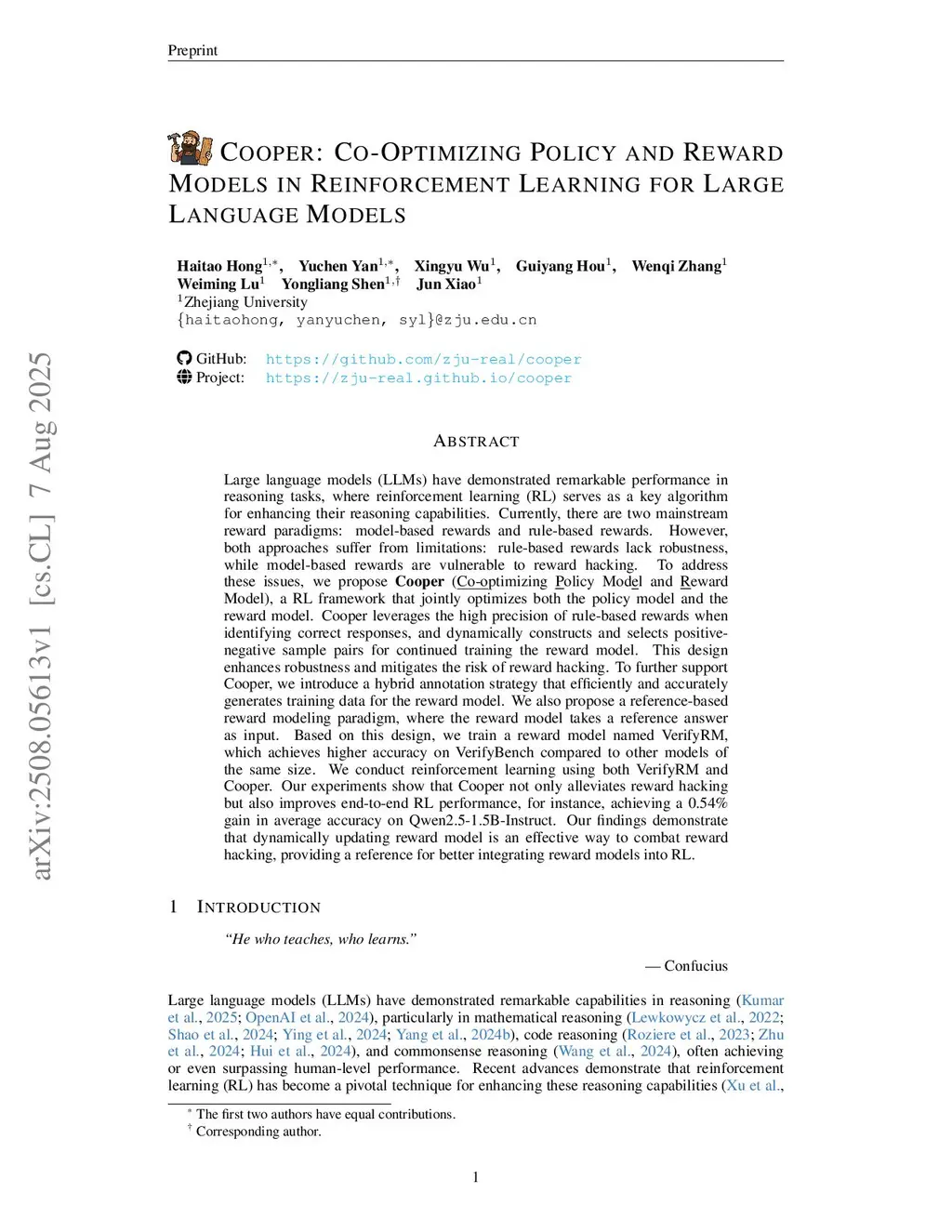 Large language models (LLMs) have demonstrated remarkable performance in reasoning tasks, where reinforcement learning (RL) serves as a key algorithm for enhancing their reasoning capabilities. Currently, there are two mainstream reward paradigms: model-based rewards and rule-based rewards. However, both approaches suffer from limitations: rule-based rewards lack robustness, while model-based rewards are vulnerable to reward hacking. To address these issues, we propose Cooper(Co-optimizing Policy Model and Reward Model), a RL framework that jointly optimizes both the policy model and the reward model. Cooper leverages the high precision of rule-based rewards when identifying correct responses, and dynamically constructs and selects positive-negative sample pairs for continued training the reward model. This design enhances robustness and mitigates the risk of reward hacking. To further support Cooper, we introduce a hybrid annotation strategy that efficiently and accurately generates training data for the reward model. We also propose a reference-based reward modeling paradigm, where the reward model takes a reference answer as input. Based on this design, we train a reward model named VerifyRM, which achieves higher accuracy on VerifyBench compared to other models of the same size. We conduct reinforcement learning using both VerifyRM and Cooper. Our experiments show that Cooper not only alleviates reward hacking but also improves end-to-end RL performance, for instance, achieving a 0.54% gain in average accuracy on Qwen2.5-1.5B-Instruct. Our findings demonstrate that dynamically updating reward model is an effective way to combat reward hacking, providing a reference for better integrating reward models into RL.