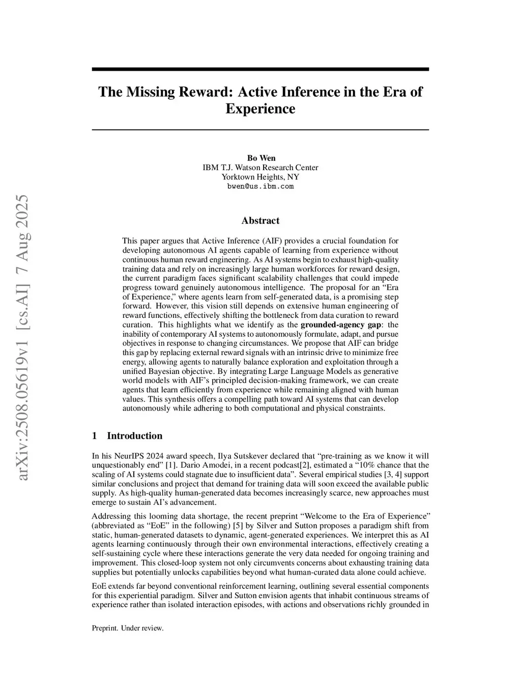 This paper argues that Active Inference (AIF) provides a crucial foundation for developing autonomous AI agents capable of learning from experience without continuous human reward engineering. As AI systems begin to exhaust high-quality training data and rely on increasingly large human workforces for reward design, the current paradigm faces significant scalability challenges that could impede progress toward genuinely autonomous intelligence. The proposal for an ``Era of Experience,'' where agents learn from self-generated data, is a promising step forward. However, this vision still depends on extensive human engineering of reward functions, effectively shifting the bottleneck from data curation to reward curation. This highlights what we identify as the \textbf{grounded-agency gap}: the inability of contemporary AI systems to autonomously formulate, adapt, and pursue objectives in response to changing circumstances. We propose that AIF can bridge this gap by replacing external reward signals with an intrinsic drive to minimize free energy, allowing agents to naturally balance exploration and exploitation through a unified Bayesian objective. By integrating Large Language Models as generative world models with AIF's principled decision-making framework, we can create agents that learn efficiently from experience while remaining aligned with human values. This synthesis offers a compelling path toward AI systems that can develop autonomously while adhering to both computational and physical constraints.