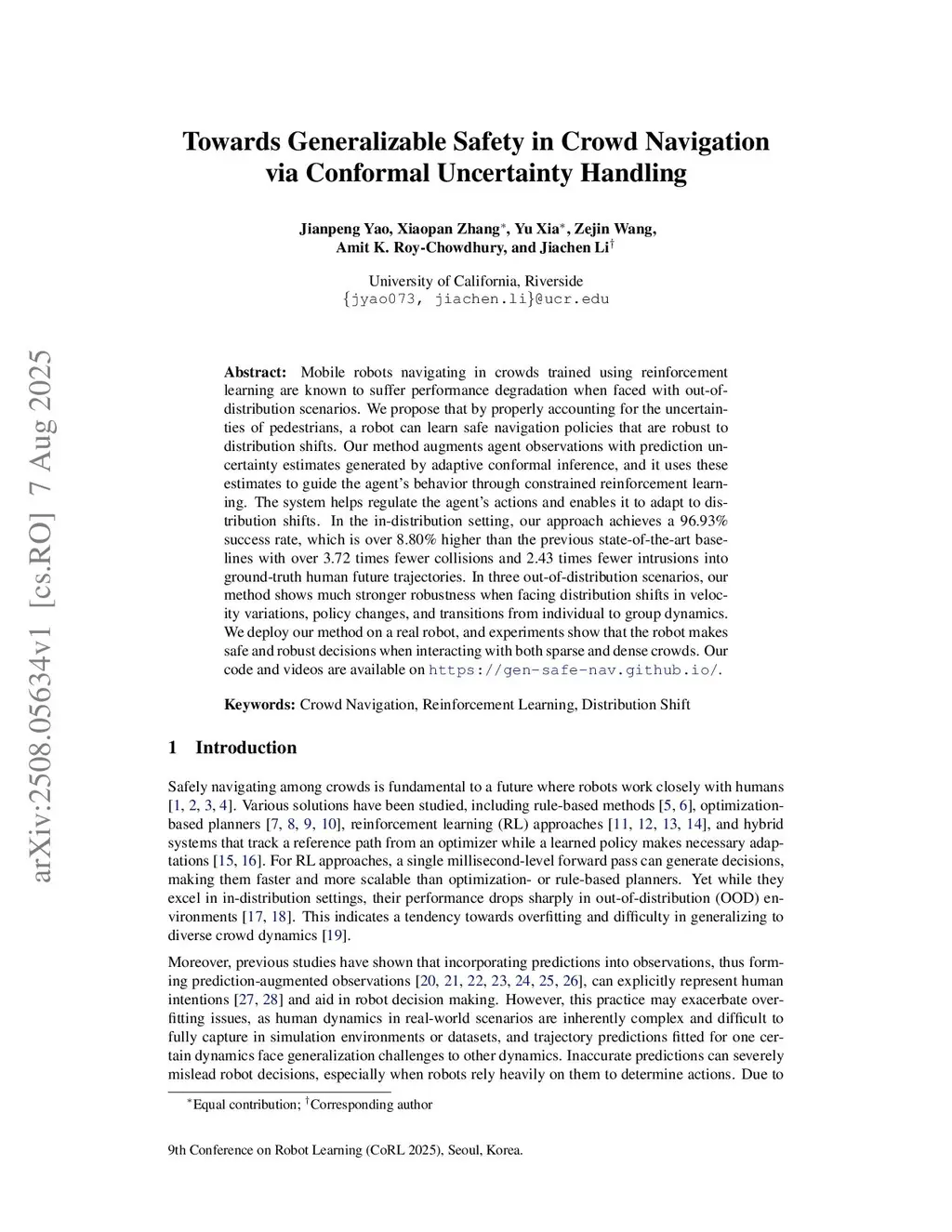 Mobile robots navigating in crowds trained using reinforcement learning are known to suffer performance degradation when faced with out-of-distribution scenarios. We propose that by properly accounting for the uncertainties of pedestrians, a robot can learn safe navigation policies that are robust to distribution shifts. Our method augments agent observations with prediction uncertainty estimates generated by adaptive conformal inference, and it uses these estimates to guide the agent's behavior through constrained reinforcement learning. The system helps regulate the agent's actions and enables it to adapt to distribution shifts. In the in-distribution setting, our approach achieves a 96.93% success rate, which is over 8.80% higher than the previous state-of-the-art baselines with over 3.72 times fewer collisions and 2.43 times fewer intrusions into ground-truth human future trajectories. In three out-of-distribution scenarios, our method shows much stronger robustness when facing distribution shifts in velocity variations, policy changes, and transitions from individual to group dynamics. We deploy our method on a real robot, and experiments show that the robot makes safe and robust decisions when interacting with both sparse and dense crowds. Our code and videos are available onthis https URL.