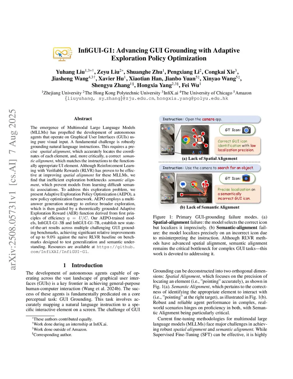 The emergence of Multimodal Large Language Models (MLLMs) has propelled the development of autonomous agents that operate on Graphical User Interfaces (GUIs) using pure visual input. A fundamental challenge is robustly grounding natural language instructions. This requires a precise spatial alignment, which accurately locates the coordinates of each element, and, more critically, a correct semantic alignment, which matches the instructions to the functionally appropriate UI element. Although Reinforcement Learning with Verifiable Rewards (RLVR) has proven to be effective at improving spatial alignment for these MLLMs, we find that inefficient exploration bottlenecks semantic alignment, which prevent models from learning difficult semantic associations. To address this exploration problem, we present Adaptive Exploration Policy Optimization (AEPO), a new policy optimization framework. AEPO employs a multi-answer generation strategy to enforce broader exploration, which is then guided by a theoretically grounded Adaptive Exploration Reward (AER) function derived from first principles of efficiency eta=U/C. Our AEPO-trained models, InfiGUI-G1-3B and InfiGUI-G1-7B, establish new state-of-the-art results across multiple challenging GUI grounding benchmarks, achieving significant relative improvements of up to 9.0% against the naive RLVR baseline on benchmarks designed to test generalization and semantic understanding. Resources are available atthis https URL.