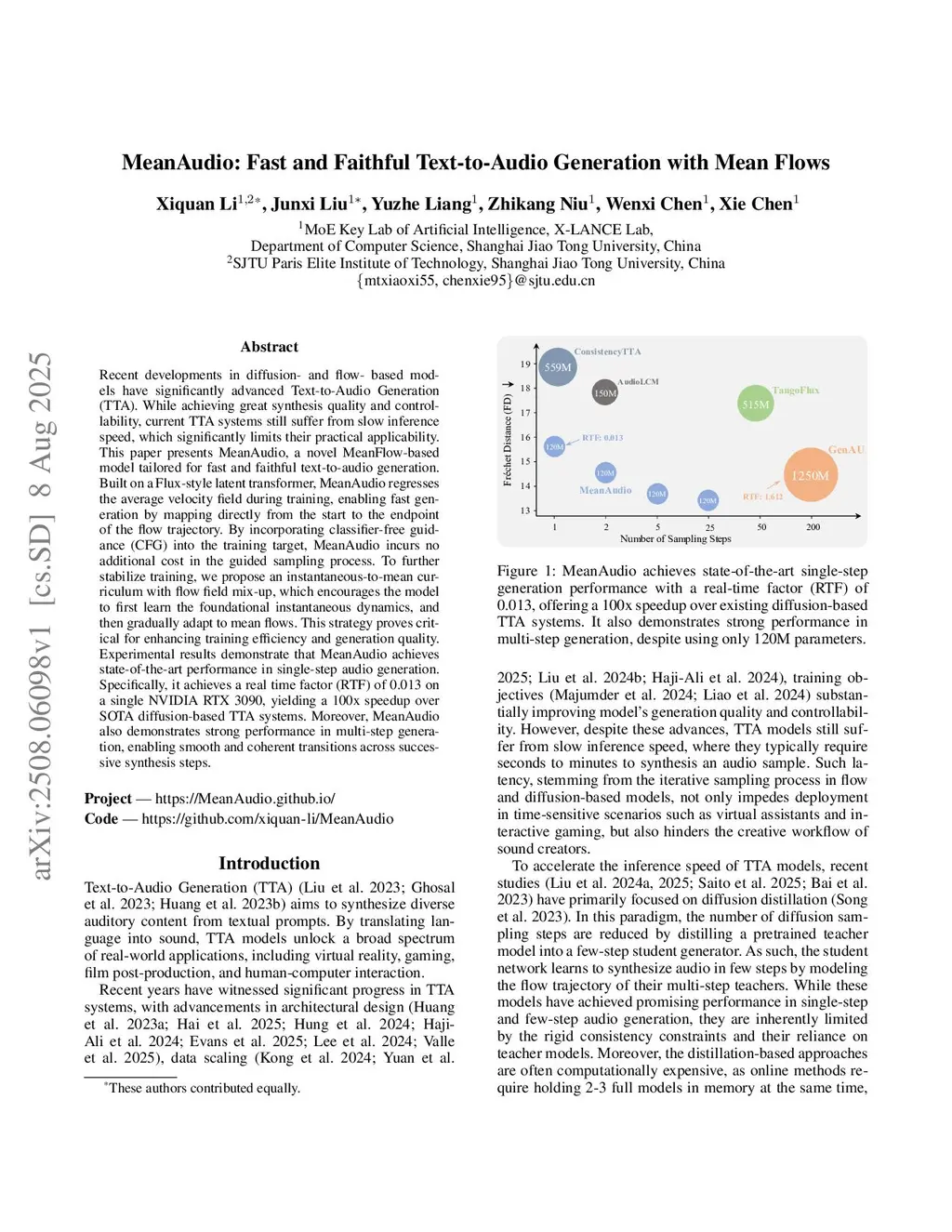 Recent years have witnessed remarkable progress in Text-to-Audio Generation (TTA), providing sound creators with powerful tools to transform inspirations into vivid audio. Yet despite these advances, current TTA systems often suffer from slow inference speed, which greatly hinders the efficiency and smoothness of audio creation. In this paper, we present MeanAudio, a fast and faithful text-to-audio generator capable of rendering realistic sound with only one function evaluation (1-NFE). MeanAudio leverages: (i) the MeanFlow objective with guided velocity target that significantly accelerates inference speed, (ii) an enhanced Flux-style transformer with dual text encoders for better semantic alignment and synthesis quality, and (iii) an efficient instantaneous-to-mean curriculum that speeds up convergence and enables training on consumer-grade GPUs. Through a comprehensive evaluation study, we demonstrate that MeanAudio achieves state-of-the-art performance in single-step audio generation. Specifically, it achieves a real-time factor (RTF) of 0.013 on a single NVIDIA RTX 3090, yielding a 100x speedup over SOTA diffusion-based TTA systems. Moreover, MeanAudio also shows strong performance in multi-step generation, enabling smooth transitions across successive synthesis steps.