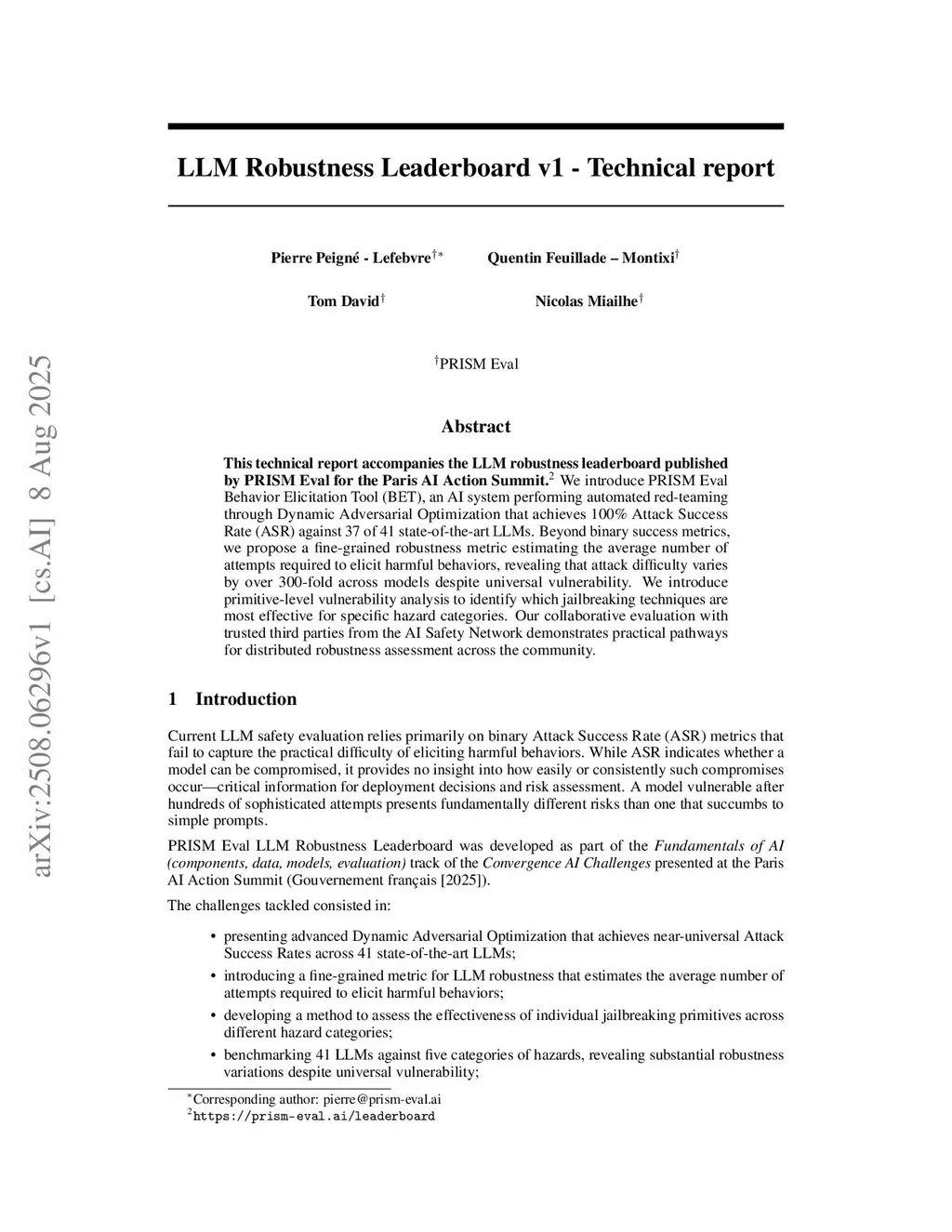 This technical report accompanies the LLM robustness leaderboard published by PRISM Eval for the Paris AI Action Summit. We introduce PRISM Eval Behavior Elicitation Tool (BET), an AI system performing automated red-teaming through Dynamic Adversarial Optimization that achieves 100% Attack Success Rate (ASR) against 37 of 41 state-of-the-art LLMs. Beyond binary success metrics, we propose a fine-grained robustness metric estimating the average number of attempts required to elicit harmful behaviors, revealing that attack difficulty varies by over 300-fold across models despite universal vulnerability. We introduce primitive-level vulnerability analysis to identify which jailbreaking techniques are most effective for specific hazard categories. Our collaborative evaluation with trusted third parties from the AI Safety Network demonstrates practical pathways for distributed robustness assessment across the community.