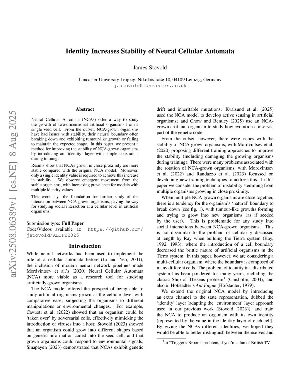 Neural Cellular Automata (NCAs) offer a way to study the growth of two-dimensional artificial organisms from a single seed cell. From the outset, NCA-grown organisms have had issues with stability, their natural boundary often breaking down and exhibiting tumour-like growth or failing to maintain the expected shape. In this paper, we present a method for improving the stability of NCA-grown organisms by introducing an ídentity' layer with simple constraints during training.Results show that NCAs grown in close proximity are more stable compared with the original NCA model. Moreover, only a single identity value is required to achieve this increase in stability. We observe emergent movement from the stable organisms, with increasing prevalence for models with multiple identity values.This work lays the foundation for further study of the interaction between NCA-grown organisms, paving the way for studying social interaction at a cellular level in artificial organisms.Code/Videos available at:this https URL