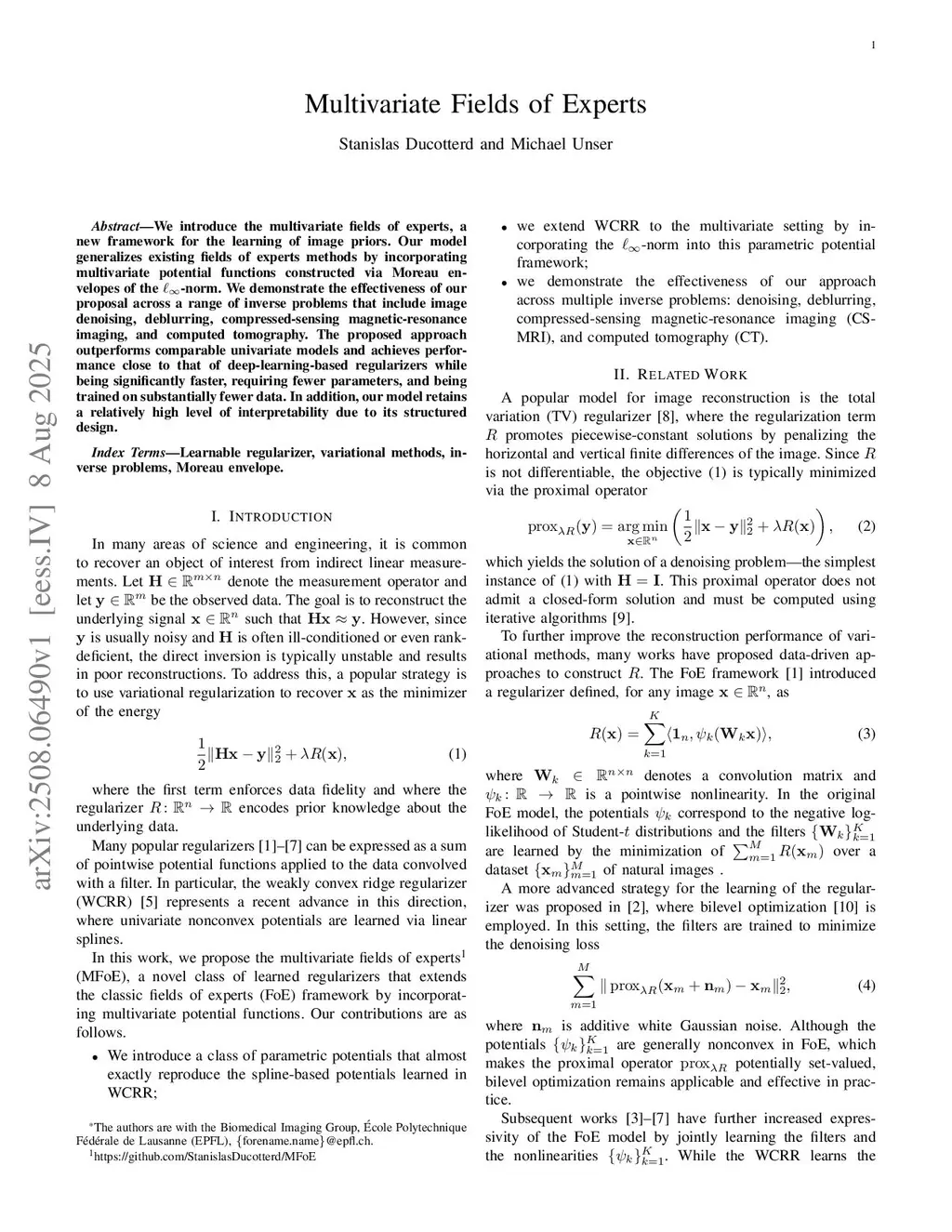 We introduce the multivariate fields of experts, a new framework for the learning of image priors. Our model generalizes existing fields of experts methods by incorporating multivariate potential functions constructed via Moreau envelopes of the -norm. We demonstrate the effectiveness of our proposal across a range of inverse problems that include image denoising, deblurring, compressed-sensing magnetic-resonance imaging, and computed tomography. The proposed approach outperforms comparable univariate models and achieves performance close to that of deep-learning-based regularizers while being significantly faster, requiring fewer parameters, and being trained on substantially fewer data. In addition, our model retains a high level of interpretability due to its structured design. It is supported by theoretical convergence guarantees which ensure reliability in sensitive reconstruction tasks.