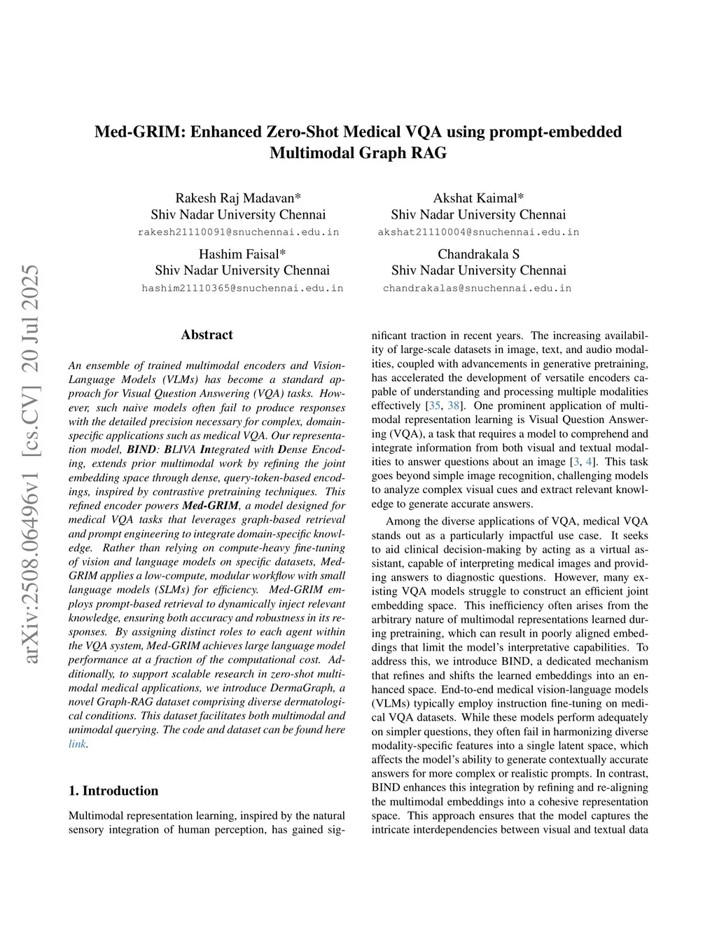 An ensemble of trained multimodal encoders and vision-language models (VLMs) has become a standard approach for visual question answering (VQA) tasks. However, such models often fail to produce responses with the detailed precision necessary for complex, domain-specific applications such as medical VQA. Our representation model, BIND: BLIVA Integrated with Dense Encoding, extends prior multimodal work by refining the joint embedding space through dense, query-token-based encodings inspired by contrastive pretraining techniques. This refined encoder powers Med-GRIM, a model designed for medical VQA tasks that leverages graph-based retrieval and prompt engineering to integrate domain-specific knowledge. Rather than relying on compute-heavy fine-tuning of vision and language models on specific datasets, Med-GRIM applies a low-compute, modular workflow with small language models (SLMs) for efficiency. Med-GRIM employs prompt-based retrieval to dynamically inject relevant knowledge, ensuring both accuracy and robustness in its responses. By assigning distinct roles to each agent within the VQA system, Med-GRIM achieves large language model performance at a fraction of the computational cost. Additionally, to support scalable research in zero-shot multimodal medical applications, we introduce DermaGraph, a novel Graph-RAG dataset comprising diverse dermatological conditions. This dataset facilitates both multimodal and unimodal querying. The code and dataset are available at:this https URL