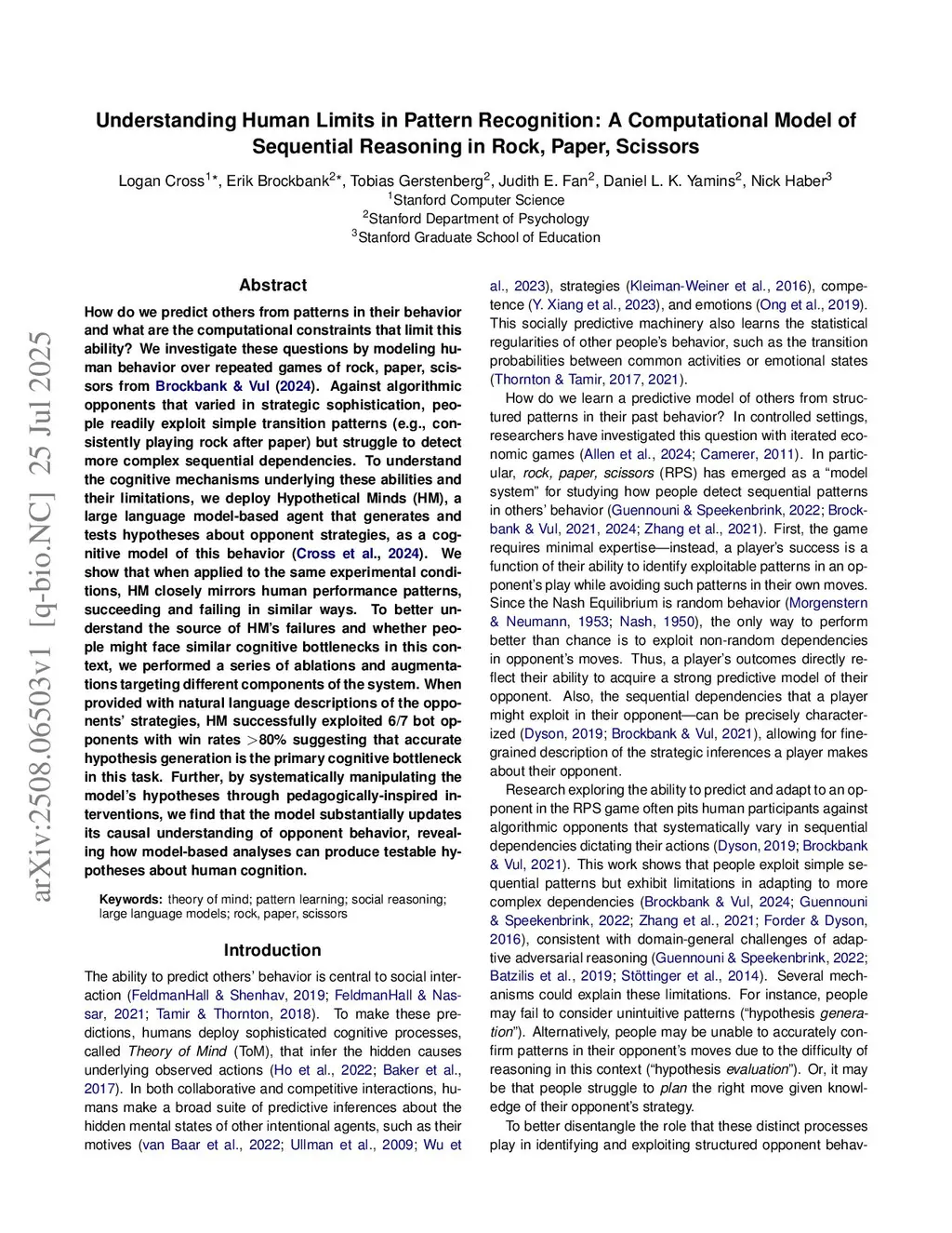 How do we predict others from patterns in their behavior and what are the computational constraints that limit this ability? We investigate these questions by modeling human behavior over repeated games of rock, paper, scissors from Brockbank & Vul (2024). Against algorithmic opponents that varied in strategic sophistication, people readily exploit simple transition patterns (e.g., consistently playing rock after paper) but struggle to detect more complex sequential dependencies. To understand the cognitive mechanisms underlying these abilities and their limitations, we deploy Hypothetical Minds (HM), a large language model-based agent that generates and tests hypotheses about opponent strategies, as a cognitive model of this behavior (Cross et al., 2024). We show that when applied to the same experimental conditions, HM closely mirrors human performance patterns, succeeding and failing in similar ways. To better understand the source of HM's failures and whether people might face similar cognitive bottlenecks in this context, we performed a series of ablations and augmentations targeting different components of the system. When provided with natural language descriptions of the opponents' strategies, HM successfully exploited 6/7 bot opponents with win rates >80% suggesting that accurate hypothesis generation is the primary cognitive bottleneck in this task. Further, by systematically manipulating the model's hypotheses through pedagogically-inspired interventions, we find that the model substantially updates its causal understanding of opponent behavior, revealing how model-based analyses can produce testable hypotheses about human cognition.