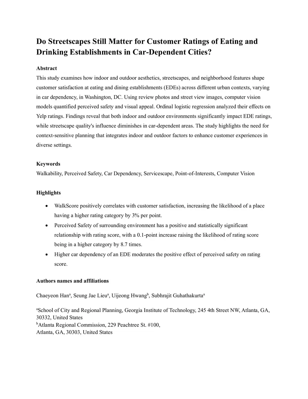 Do Streetscapes Still Matter for Customer Ratings of Eating and Drinking Establishments in Car-Dependent Cities?
