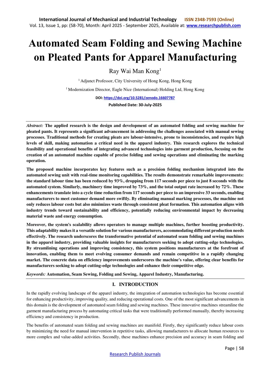 The applied research is the design and development of an automated folding and sewing machine for pleated pants. It represents a significant advancement in addressing the challenges associated with manual sewing processes. Traditional methods for creating pleats are labour-intensive, prone to inconsistencies, and require high levels of skill, making automation a critical need in the apparel industry. This research explores the technical feasibility and operational benefits of integrating advanced technologies into garment production, focusing on the creation of an automated machine capable of precise folding and sewing operations and eliminating the marking operation.The proposed machine incorporates key features such as a precision folding mechanism integrated into the automated sewing unit with real-time monitoring capabilities. The results demonstrate remarkable improvements: the standard labour time has been reduced by 93%, dropping from 117 seconds per piece to just 8 seconds with the automated system. Similarly, machinery time improved by 73%, and the total output rate increased by 72%. These enhancements translate into a cycle time reduction from 117 seconds per piece to an impressive 33 seconds, enabling manufacturers to meet customer demand more swiftly. By eliminating manual marking processes, the machine not only reduces labour costs but also minimizes waste through consistent pleat formation. This automation aligns with industry trends toward sustainability and efficiency, potentially reducing environmental impact by decreasing material waste and energy consumption.