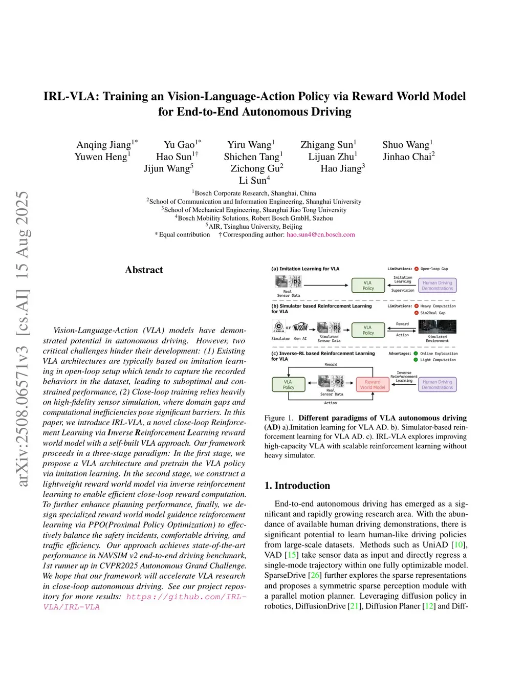 Vision-Language-Action (VLA) models have demonstrated potential in autonomous driving. However, two critical challenges hinder their development: (1) Existing VLA architectures are typically based on imitation learning in open-loop setup which tends to capture the recorded behaviors in the dataset, leading to suboptimal and constrained performance, (2) Close-loop training relies heavily on high-fidelity sensor simulation, where domain gaps and computational inefficiencies pose significant barriers. In this paper, we introduce IRL-VLA, a novel close-loop Reinforcement Learning via \textbf{I}nverse \textbf{R}einforcement \textbf{L}earning reward world model with a self-built VLA approach. Our framework proceeds in a three-stage paradigm: In the first stage, we propose a VLA architecture and pretrain the VLA policy via imitation learning. In the second stage, we construct a lightweight reward world model via inverse reinforcement learning to enable efficient close-loop reward computation. To further enhance planning performance, finally, we design specialized reward world model guidence reinforcement learning via PPO(Proximal Policy Optimization) to effectively balance the safety incidents, comfortable driving, and traffic efficiency. Our approach achieves state-of-the-art performance in NAVSIM v2 end-to-end driving benchmark, 1st runner up in CVPR2025 Autonomous Grand Challenge. We hope that our framework will accelerate VLA research in close-loop autonomous driving.