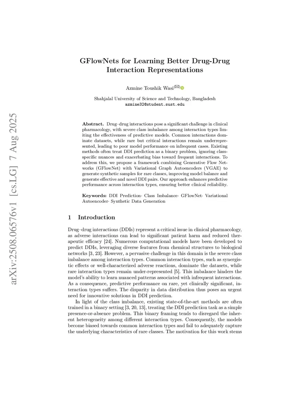 Drug-drug interactions pose a significant challenge in clinical pharmacology, with severe class imbalance among interaction types limiting the effectiveness of predictive models. Common interactions dominate datasets, while rare but critical interactions remain underrepresented, leading to poor model performance on infrequent cases. Existing methods often treat DDI prediction as a binary problem, ignoring class-specific nuances and exacerbating bias toward frequent interactions. To address this, we propose a framework combining Generative Flow Networks (GFlowNet) with Variational Graph Autoencoders (VGAE) to generate synthetic samples for rare classes, improving model balance and generate effective and novel DDI pairs. Our approach enhances predictive performance across interaction types, ensuring better clinical reliability.