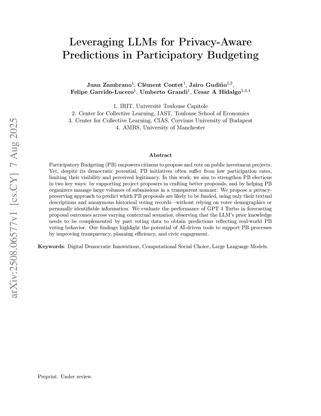 Participatory Budgeting (PB) empowers citizens to propose and vote on public investment projects. Yet, despite its democratic potential, PB initiatives often suffer from low participation rates, limiting their visibility and perceived legitimacy. In this work, we aim to strengthen PB elections in two key ways: by supporting project proposers in crafting better proposals, and by helping PB organizers manage large volumes of submissions in a transparent manner. We propose a privacy-preserving approach to predict which PB proposals are likely to be funded, using only their textual descriptions and anonymous historical voting records -- without relying on voter demographics or personally identifiable information. We evaluate the performance of GPT 4 Turbo in forecasting proposal outcomes across varying contextual scenarios, observing that the LLM's prior knowledge needs to be complemented by past voting data to obtain predictions reflecting real-world PB voting behavior. Our findings highlight the potential of AI-driven tools to support PB processes by improving transparency, planning efficiency, and civic engagement.